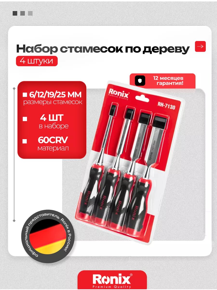 Стамеска по дереву Ronix резцы сталь Cr-V набор 4 шт для столярных работ информация: