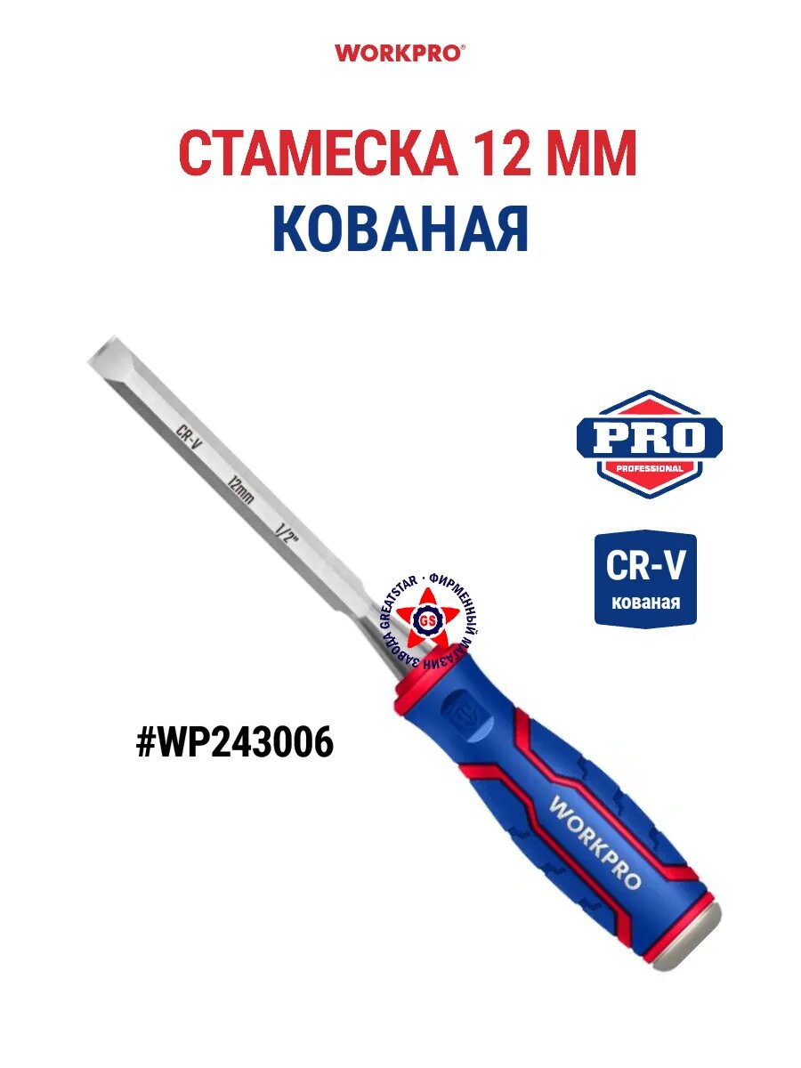 Отзывы на Стамеска-долото с двухкомпонентной рукояткой, 12 мм, CR-V WP243006, WORKPRO #WP243006, цвет синий