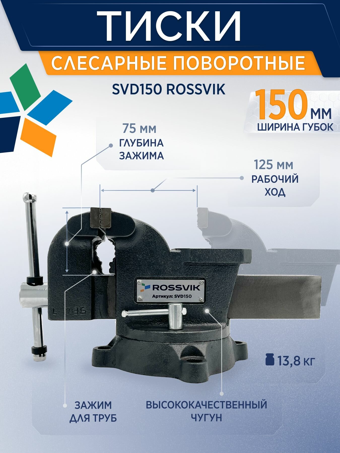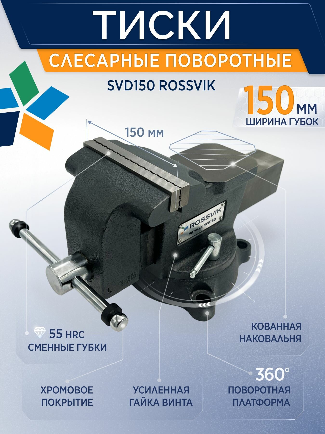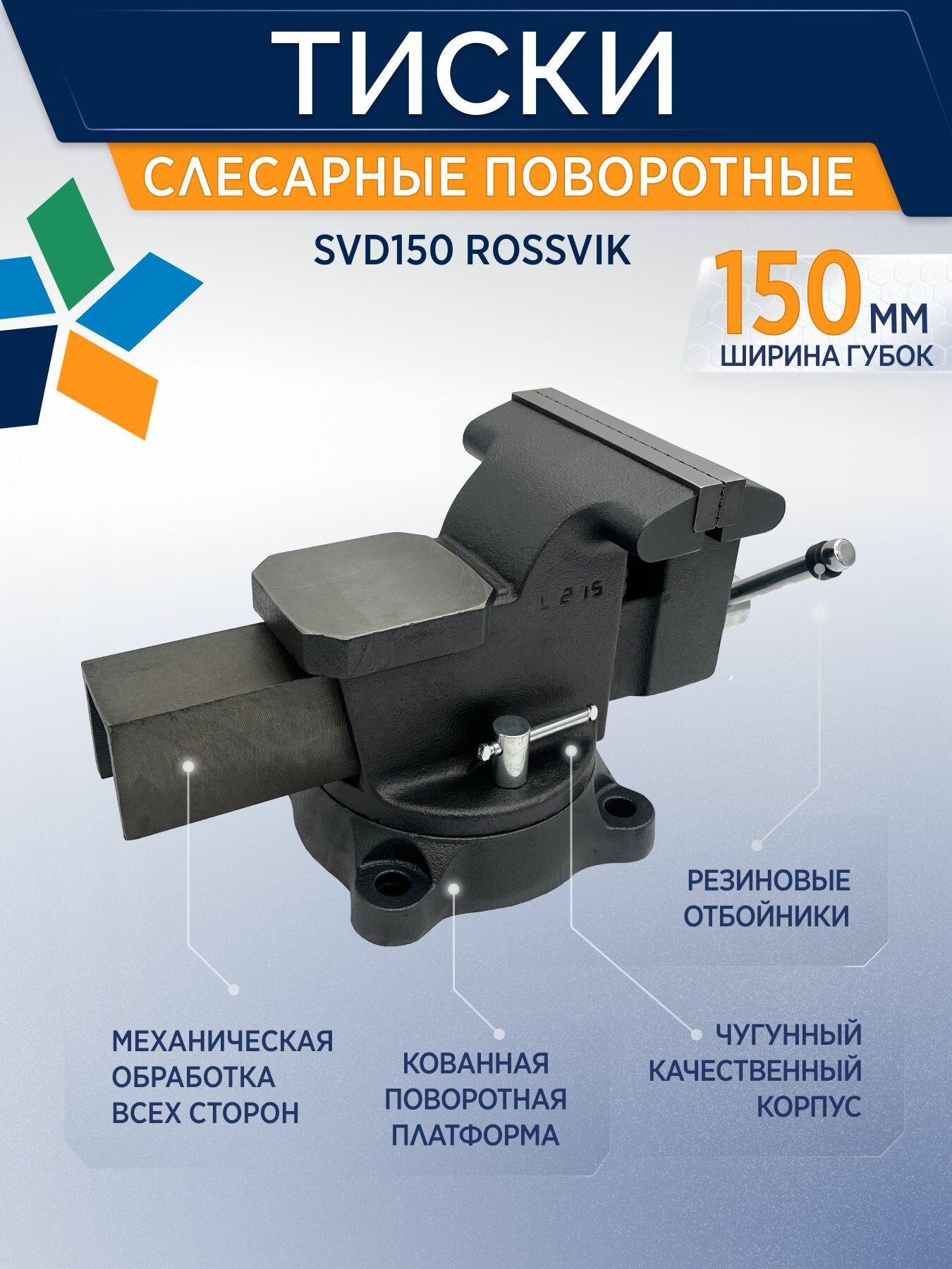 ROSSVIK Тиски слесарные поворотные с наковальней 150мм, настольные чугунные с поворотным механизмом информация: