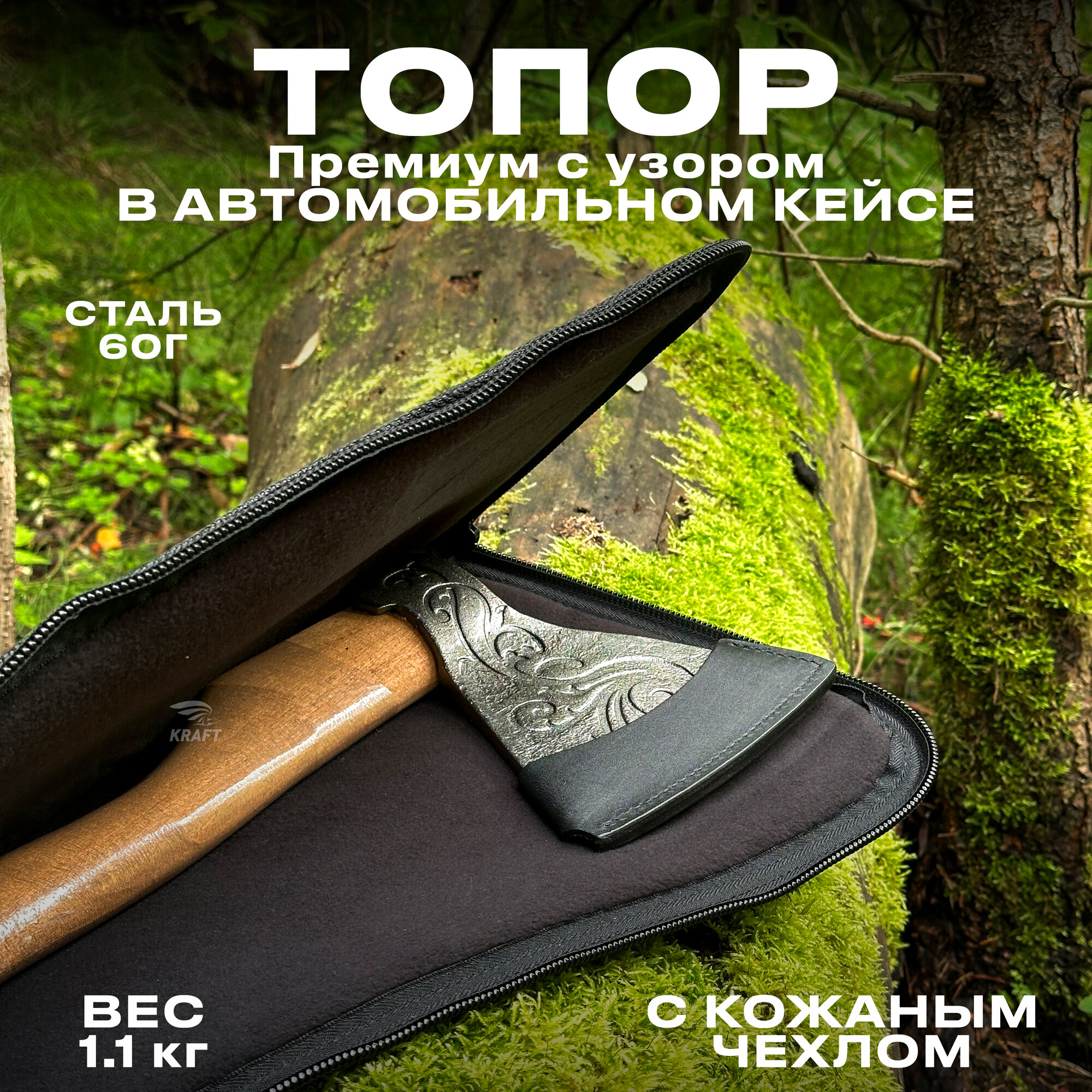 Топор кованый Премиум с узором из высокопрочной стали марки 60Г в кожаном чехле и автомобильном кейсе информация: