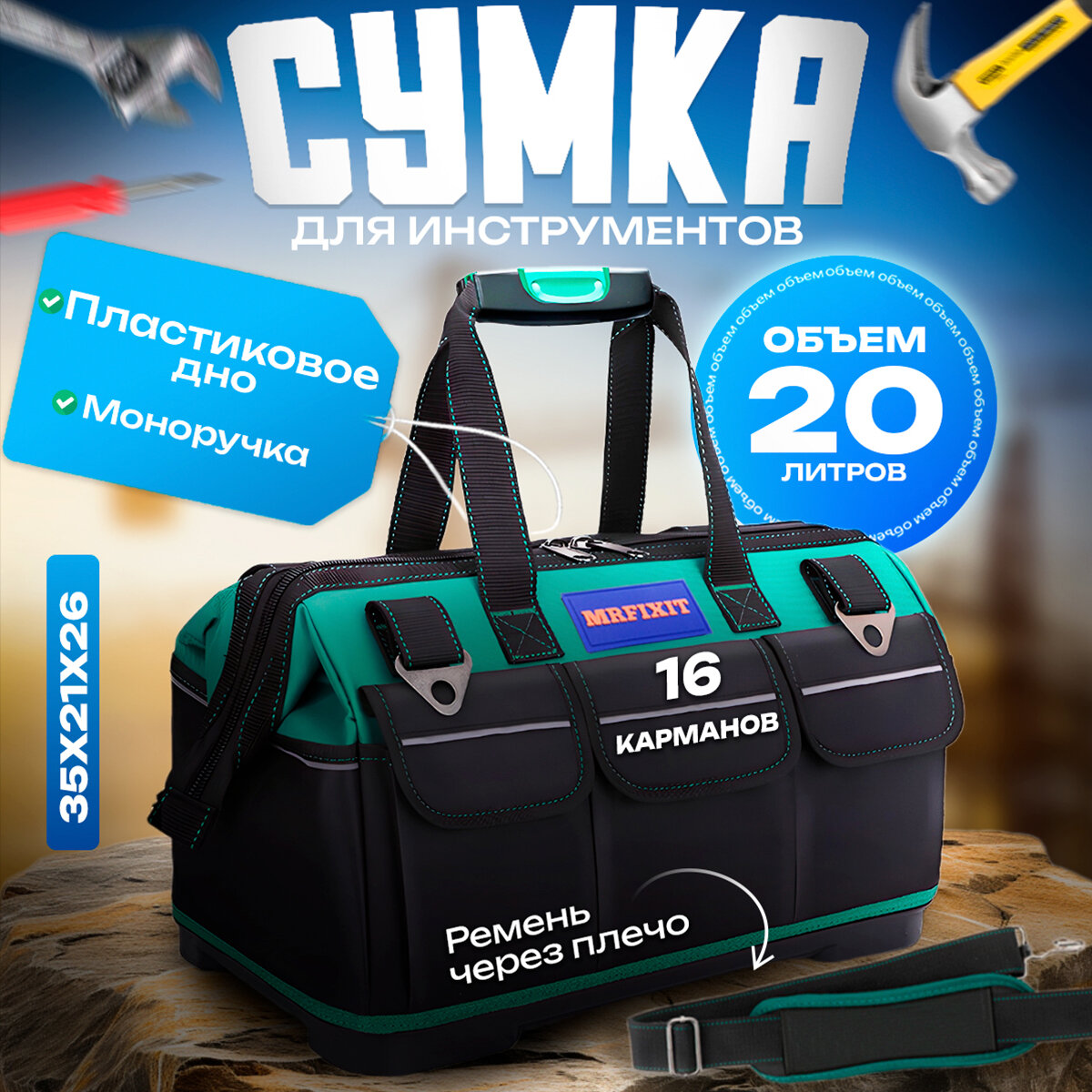 Сумка для инструментов с пластиковым дном 35*21*26см, 20 литров, влагостойкая, 16 карманов информация: