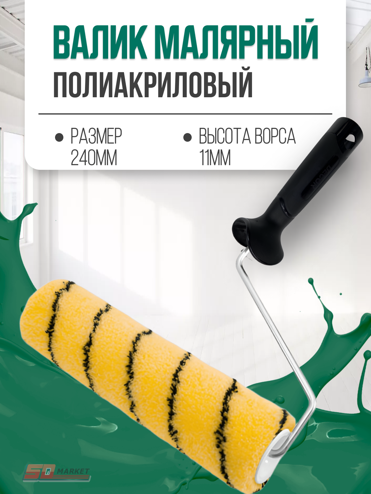 Валик 250 мм с ручкой "нейлон Стандарт ", ворс 9 мм, d-48мм, d ручки - 6 мм, полиамид