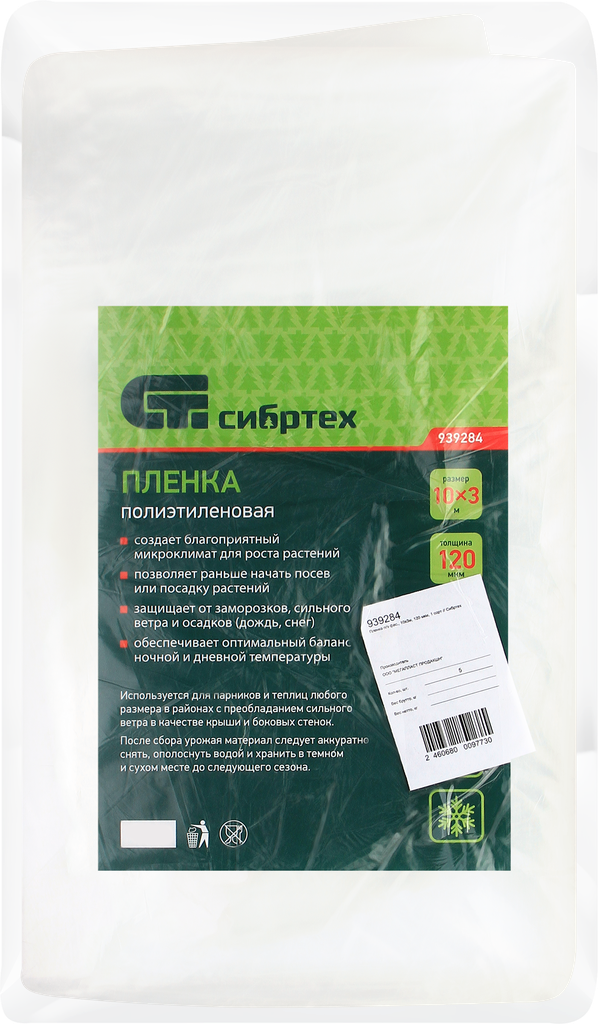 Пленка полиэтиленовая СИБРТЕХ 10x3м 120мкм 1-й сорт, Арт. 939284 информация: