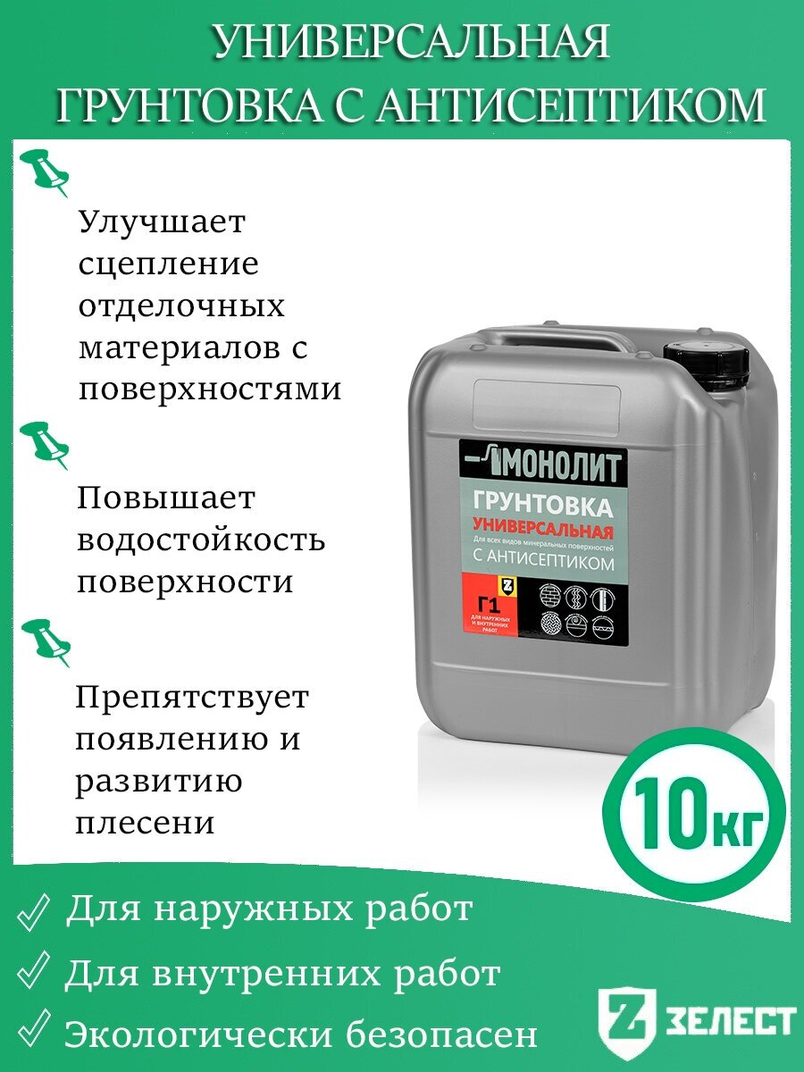 Грунтовка монолит «Г-1 Универсальная» с антисептиком, для грунтования поверхностей различных материалов, 10 кг информация:
