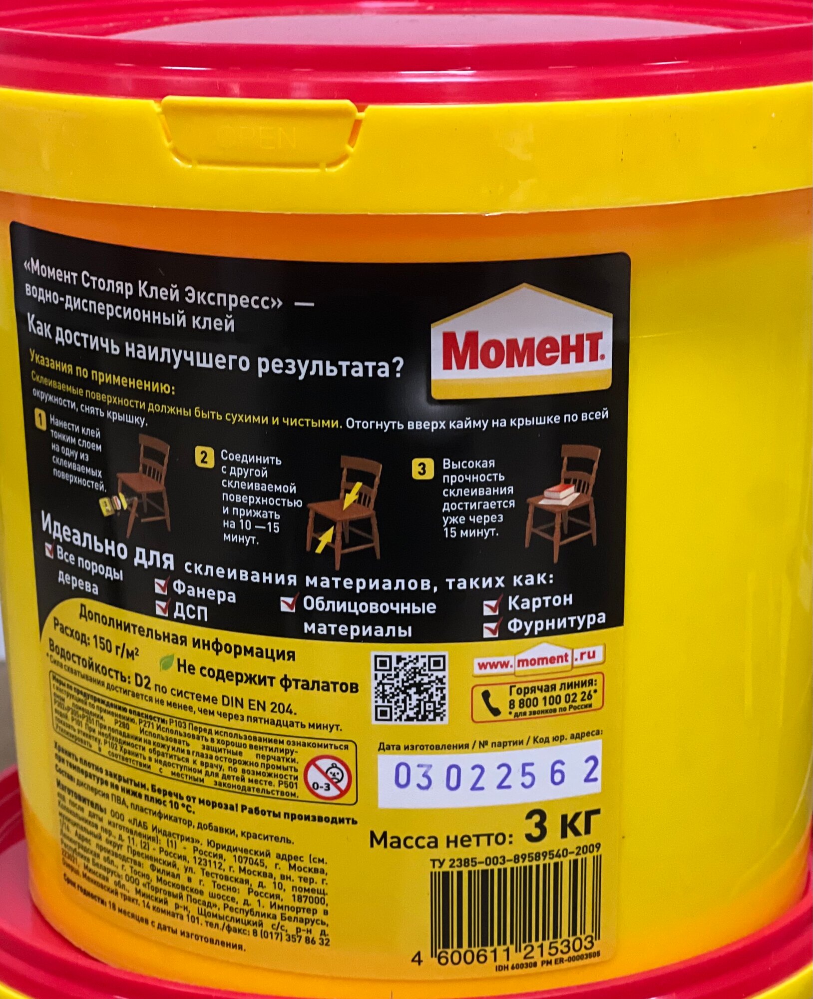 Отзывы на Клей ПВА Момент Столяр экспресс, водостойкость D2, 3кг 600308 (после высыхания цвета светлого дерева)