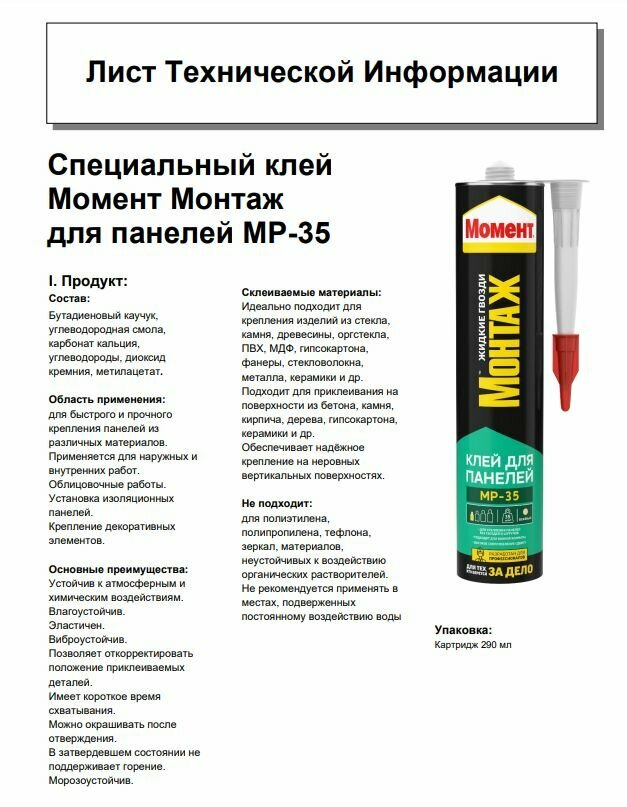 Клей Момент Монтаж для панелей 290 мл МР35 информация:
