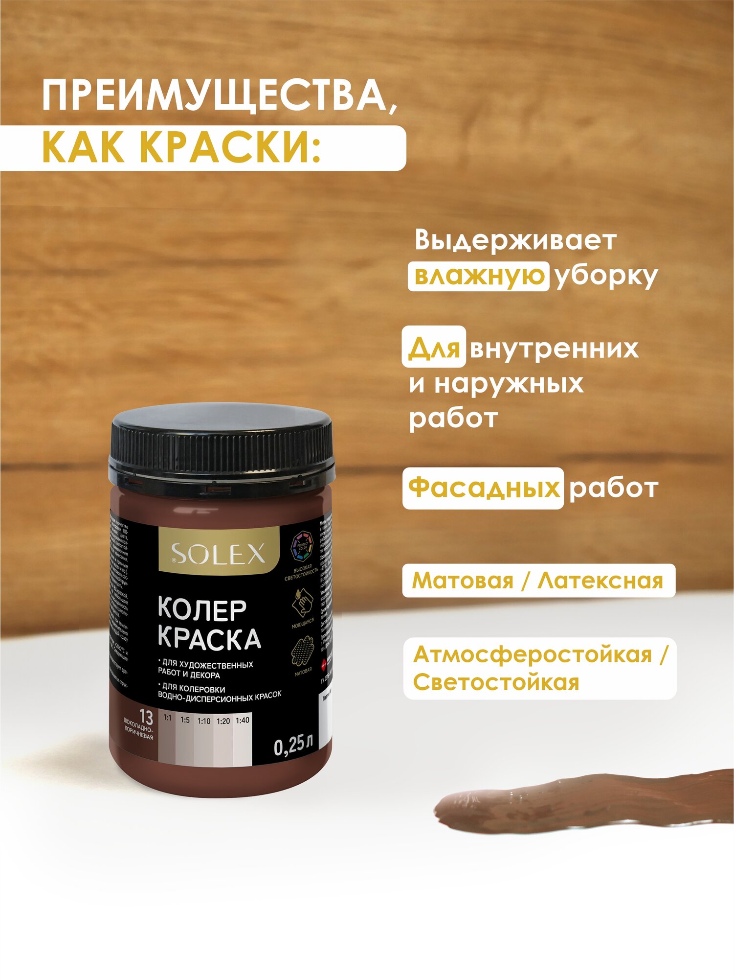 Краска колеровочная SOLEX шоколадно-коричневый 0,25л банка ПЭТ информация: