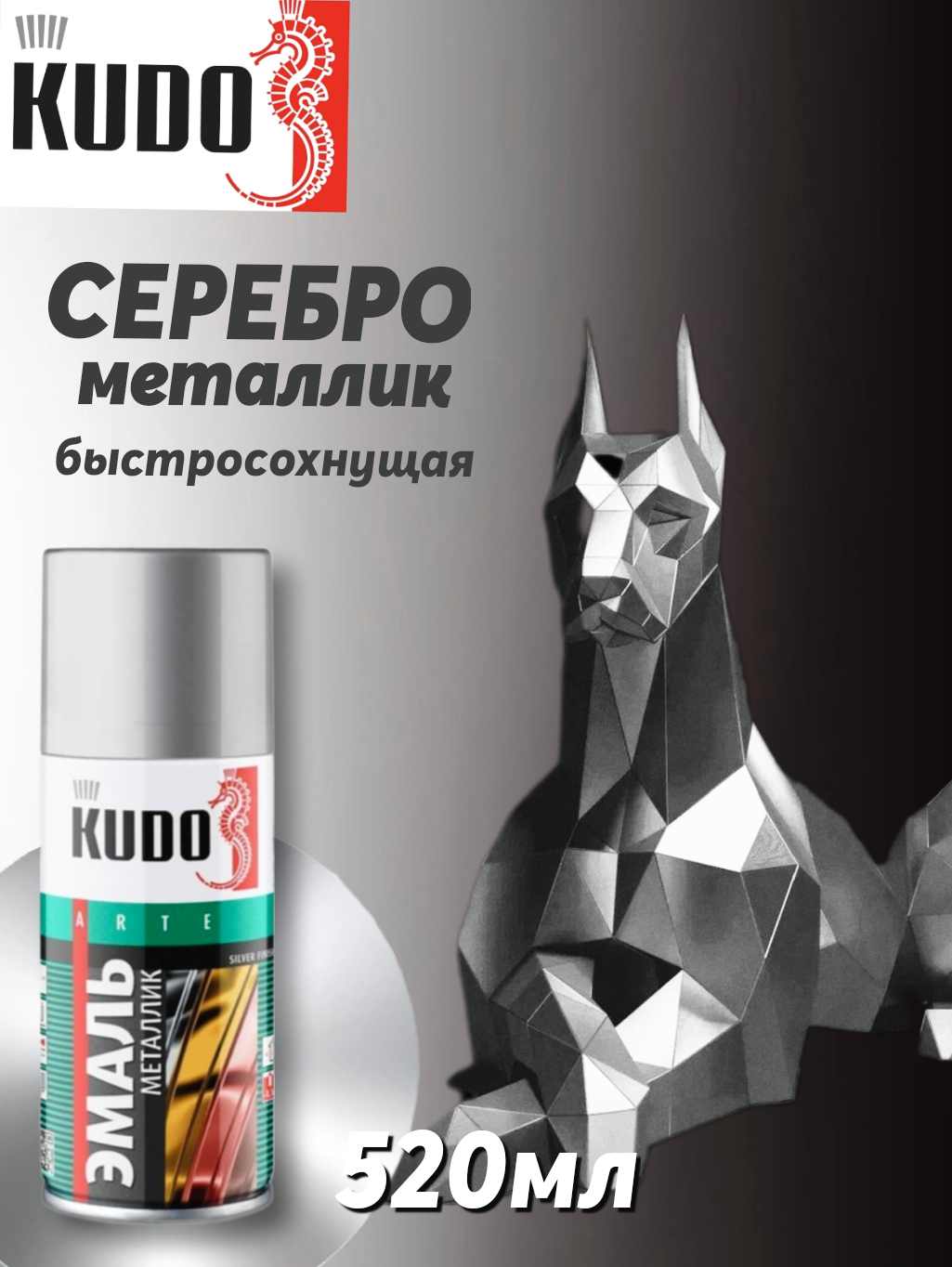 Краска серебреная в баллончике KUDO, акриловая основа, высокоустойчивая, 520мл информация: