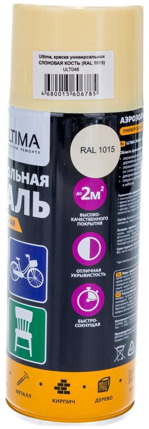 Эмаль аэрозольная ULTIMA ULT046 RAL1015 акриловая, универсальная, слоновая кость, 520 мл информация: