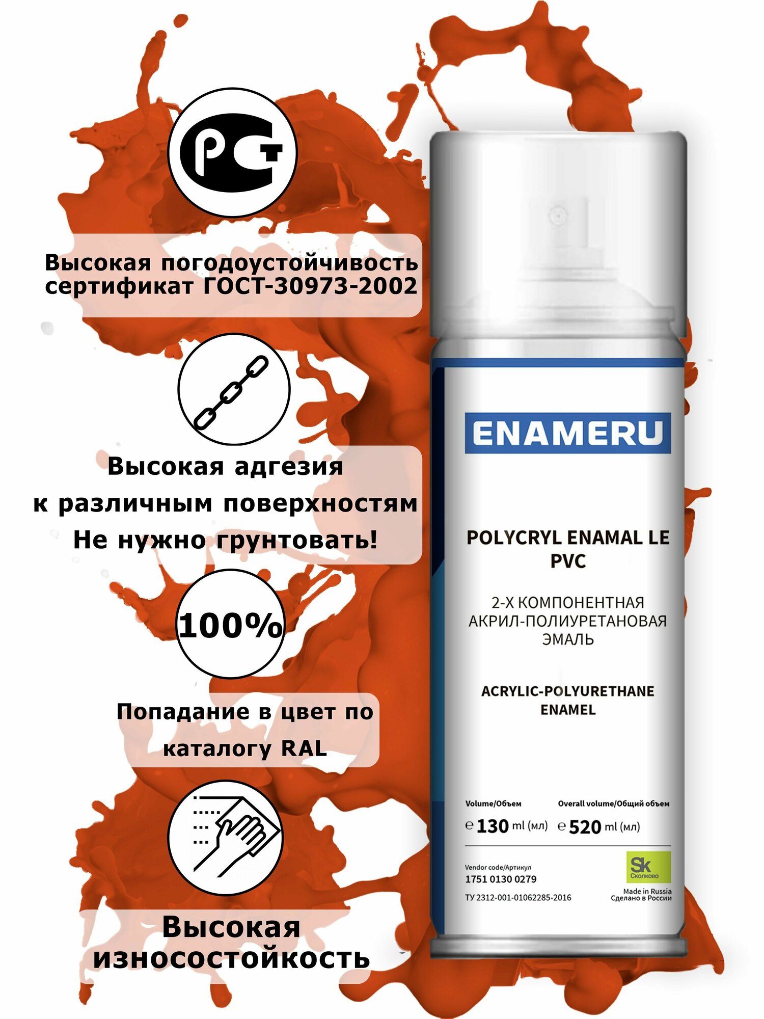 Аэрозольная краска для Стекла, Керамики Энамеру, Акрил-полиуретановая, Полуматовая, Красно-оранжевый RAL 2001, 0.52л информация: