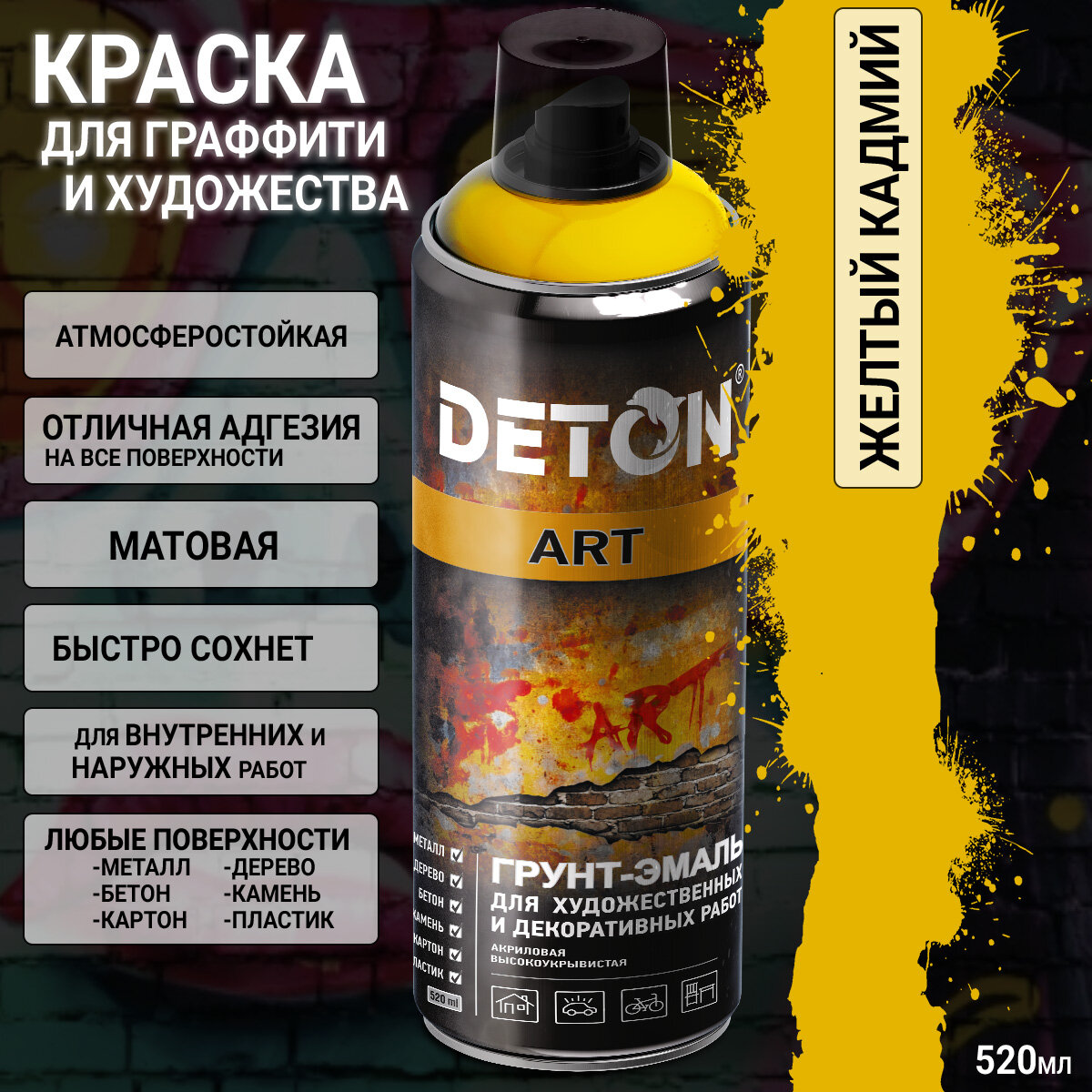 Краска для граффити и дизайна желтый кадмий универсальная DETON ART (аэрозоль, 520мл) информация: