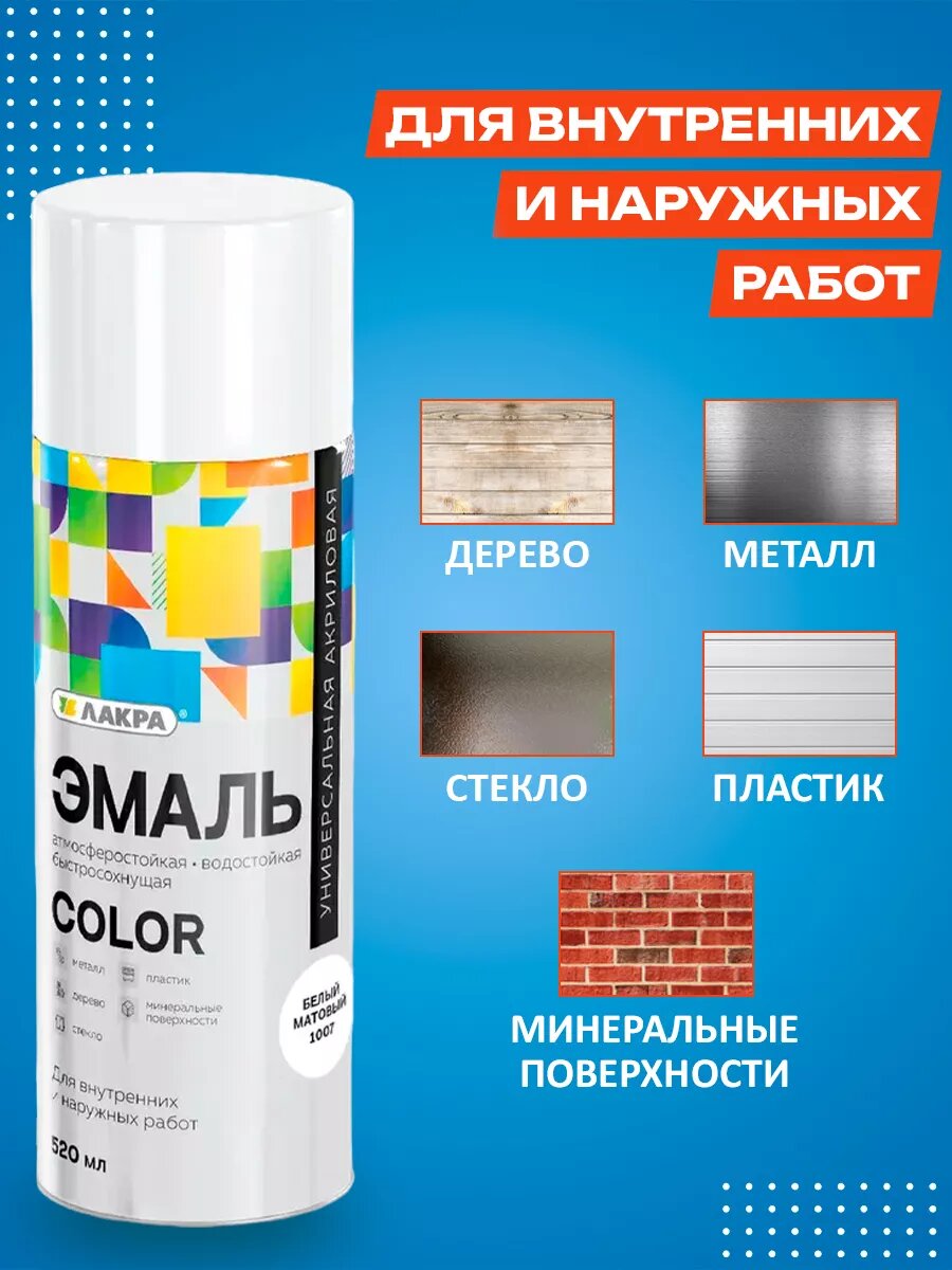 Аэрозольная краска Лакра для металла, дерева и пластика, белый матовый, акриловая, 520 мл информация: