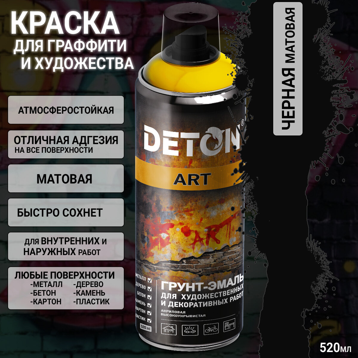 Краска для граффити и дизайна черная матовая универсальная DETON ART (аэрозоль, 520мл) информация: