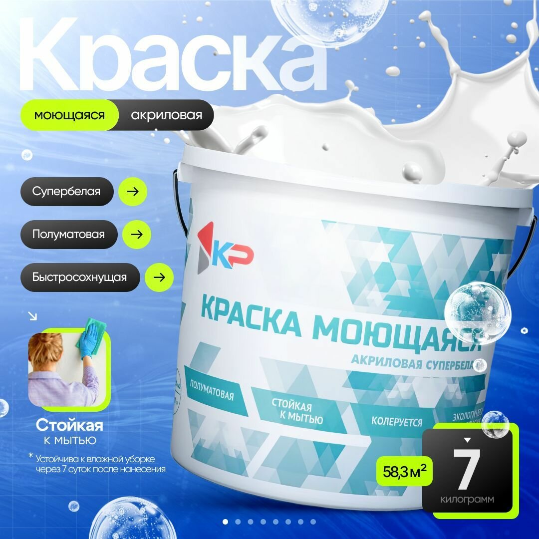 Краска для стен моющаяся КР, Быстросохнущая, Акриловая, Полуматовое покрытие, 7 кг, белый информация: