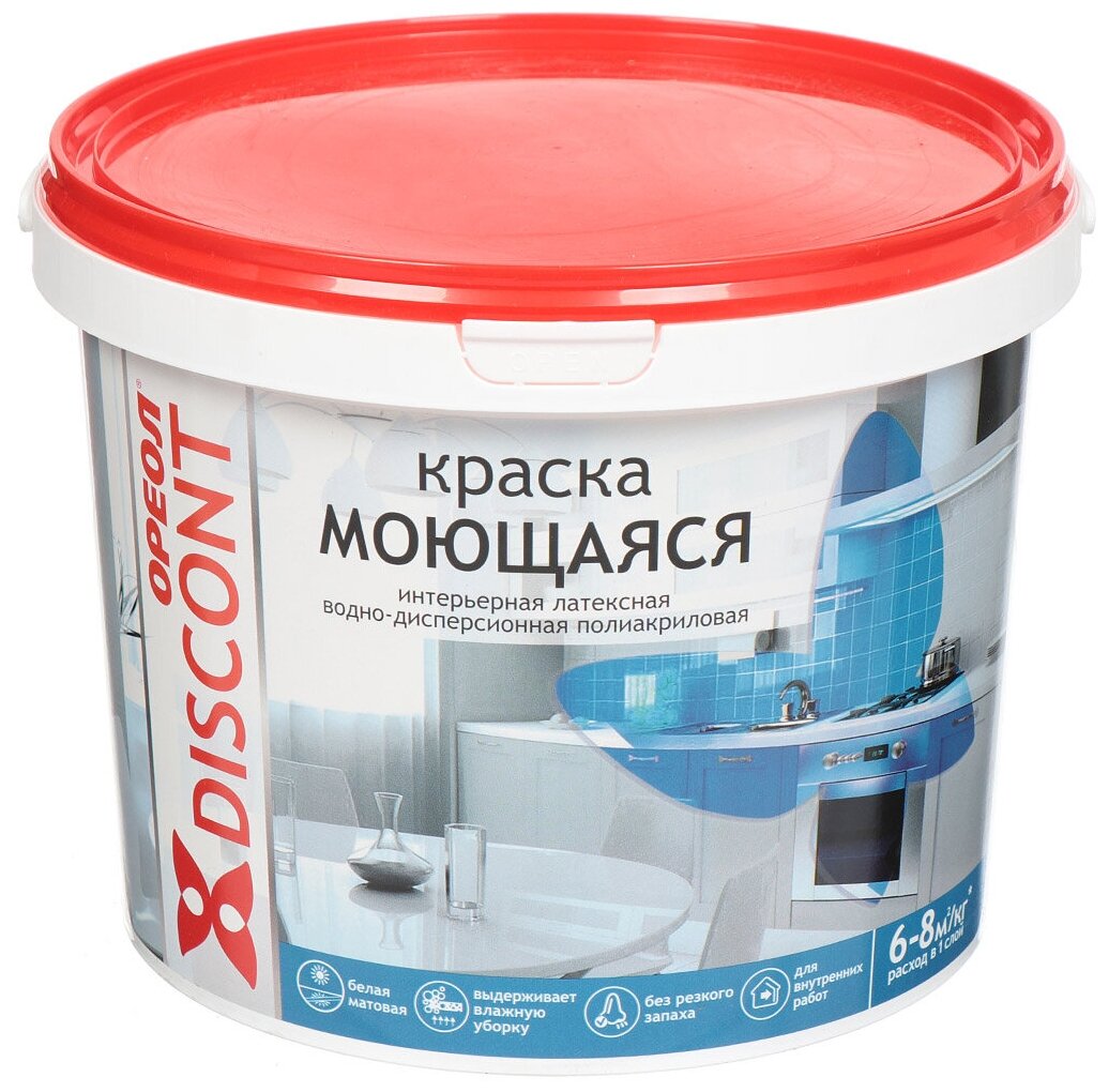 Отзывы на Краска интерьерная моющаяся водно-дисперсионная полиакриловая Ореол Дисконт белая матовая 6,5 кг.