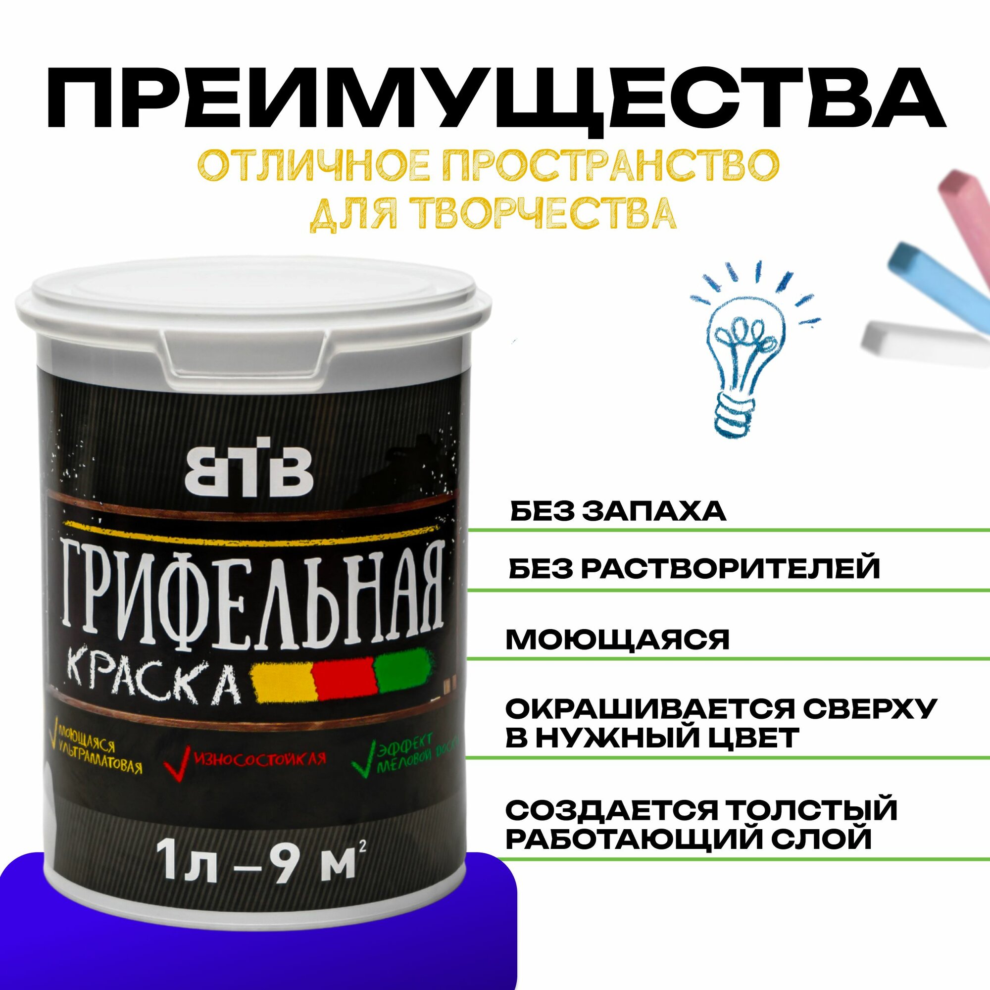 Грифельная краска ВТВ с эффектом школьной меловой доски, 1 л, черный 1 190 ₽