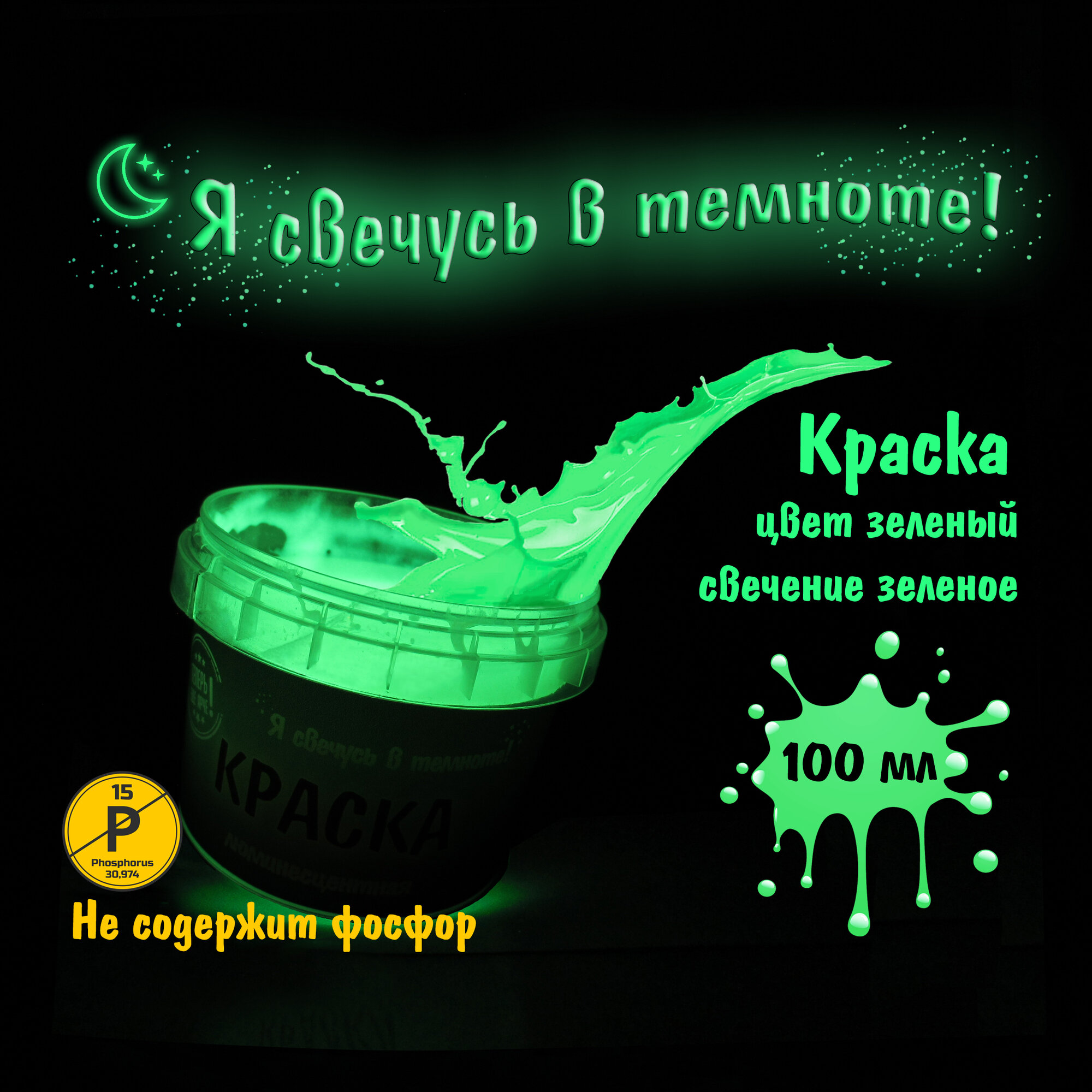 Светящаяся в темноте акриловая краска, Цвет Зеленый, Цвет свечения Зеленый, 100 мл информация: