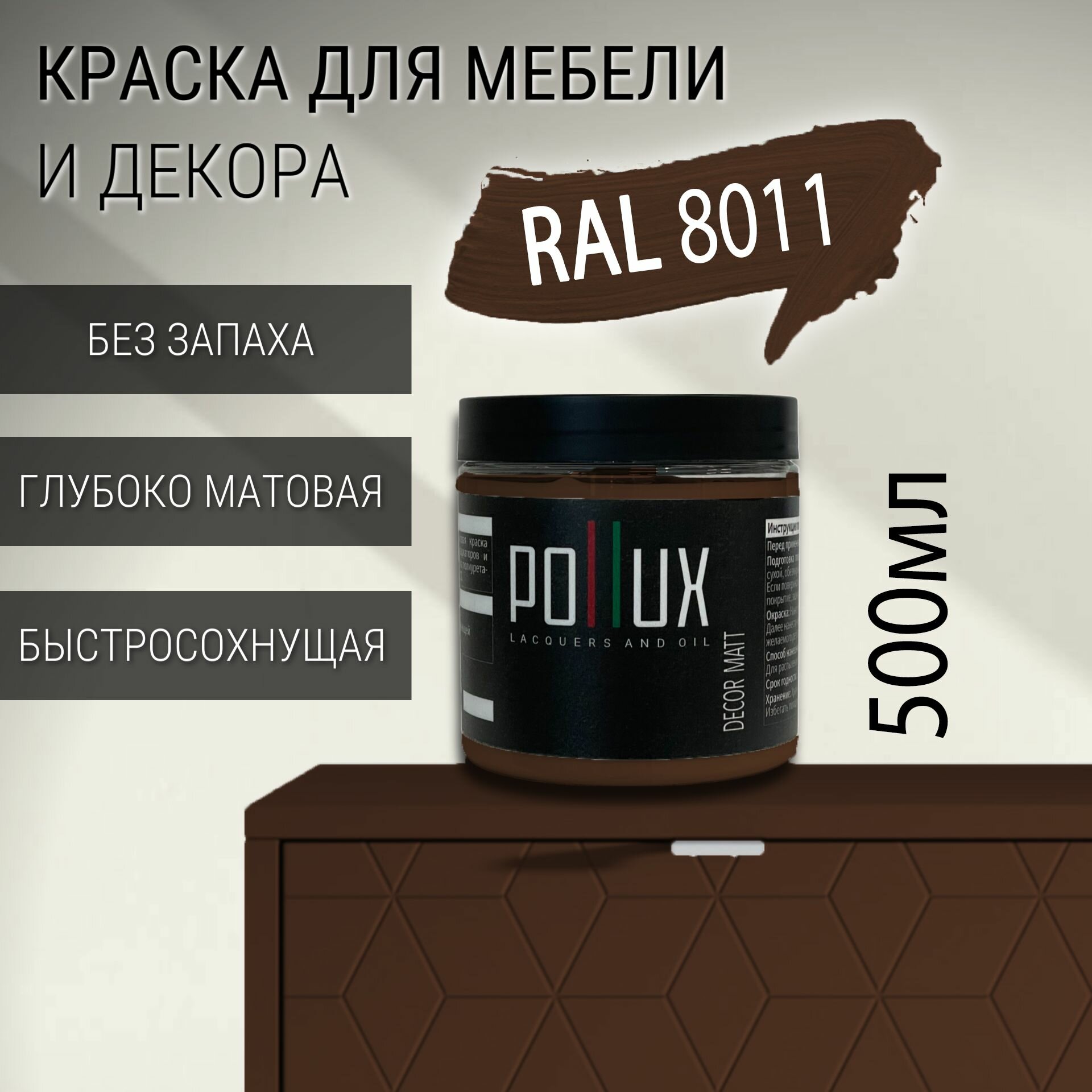 Краска для мебели без запаха матовая быстросохнущая для кухни / дерева / декора акриловая Pollux Decor Matt, объем 0,5л, цвет орехово-коричневый (RAL 8011) информация: