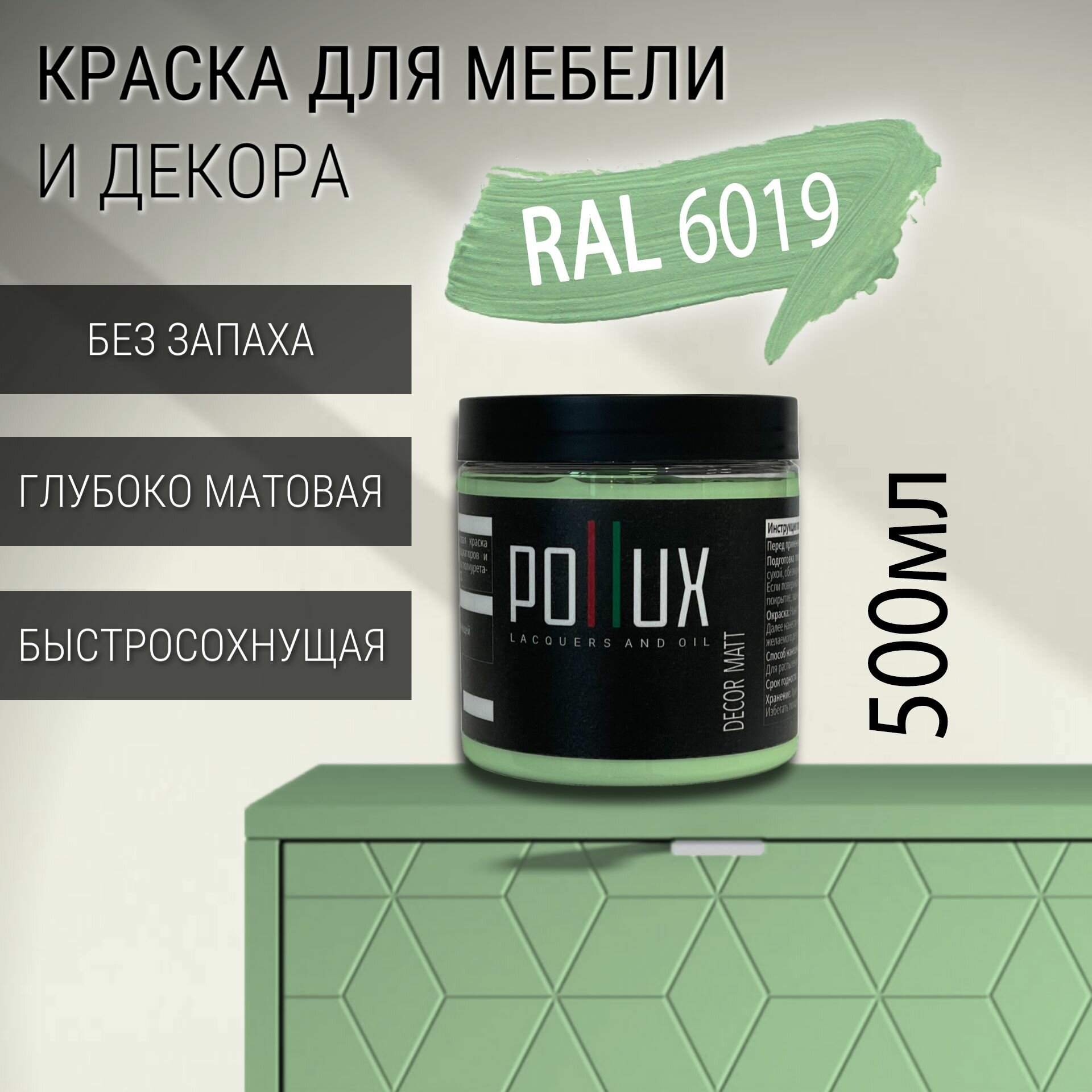 10 цен на Краска для мебели без запаха матовая быстросохнущая для кухни / дерева / декора акриловая Pollux Decor Matt, объем 0,5л, цвет бело-зелёный (RAL 6019)