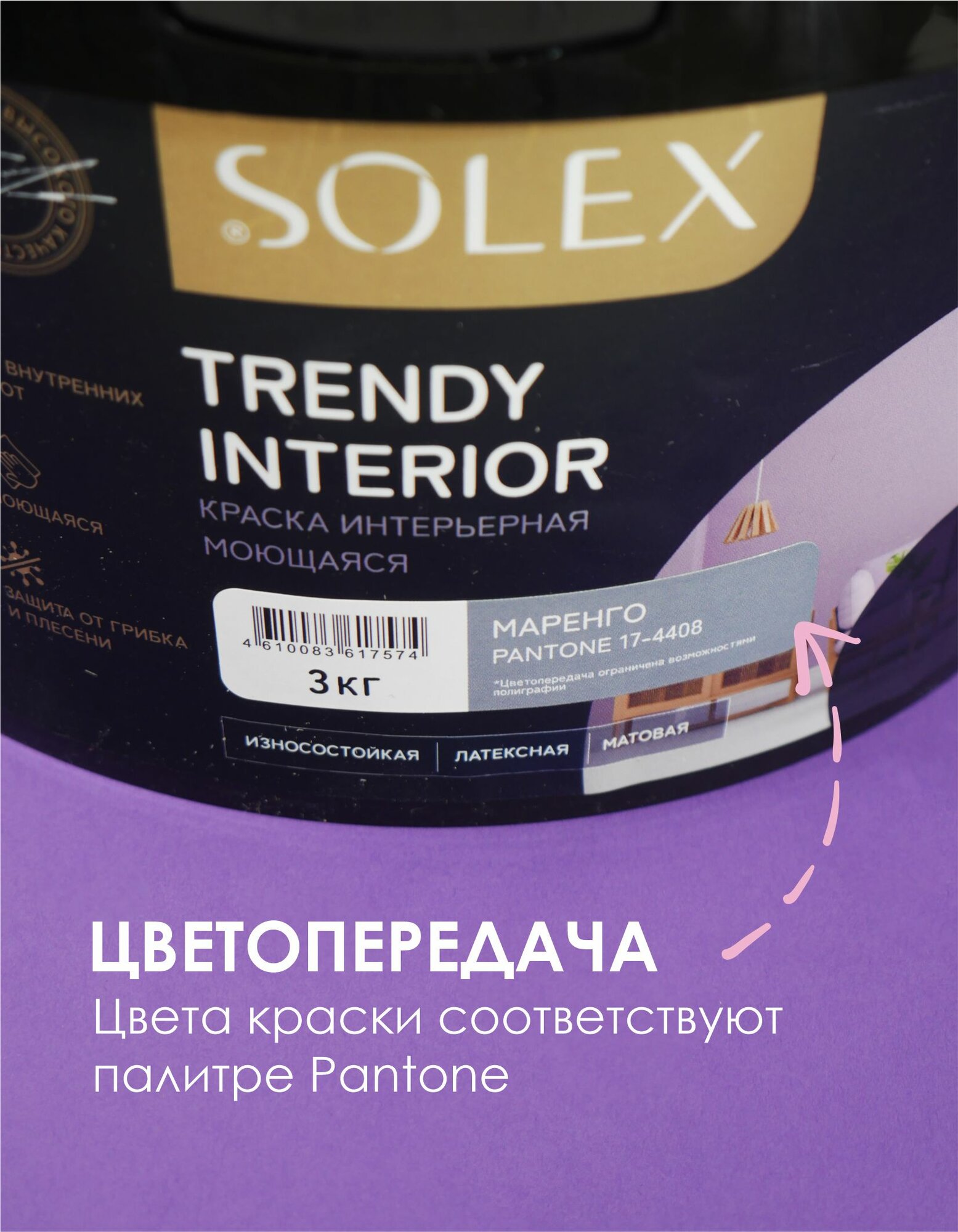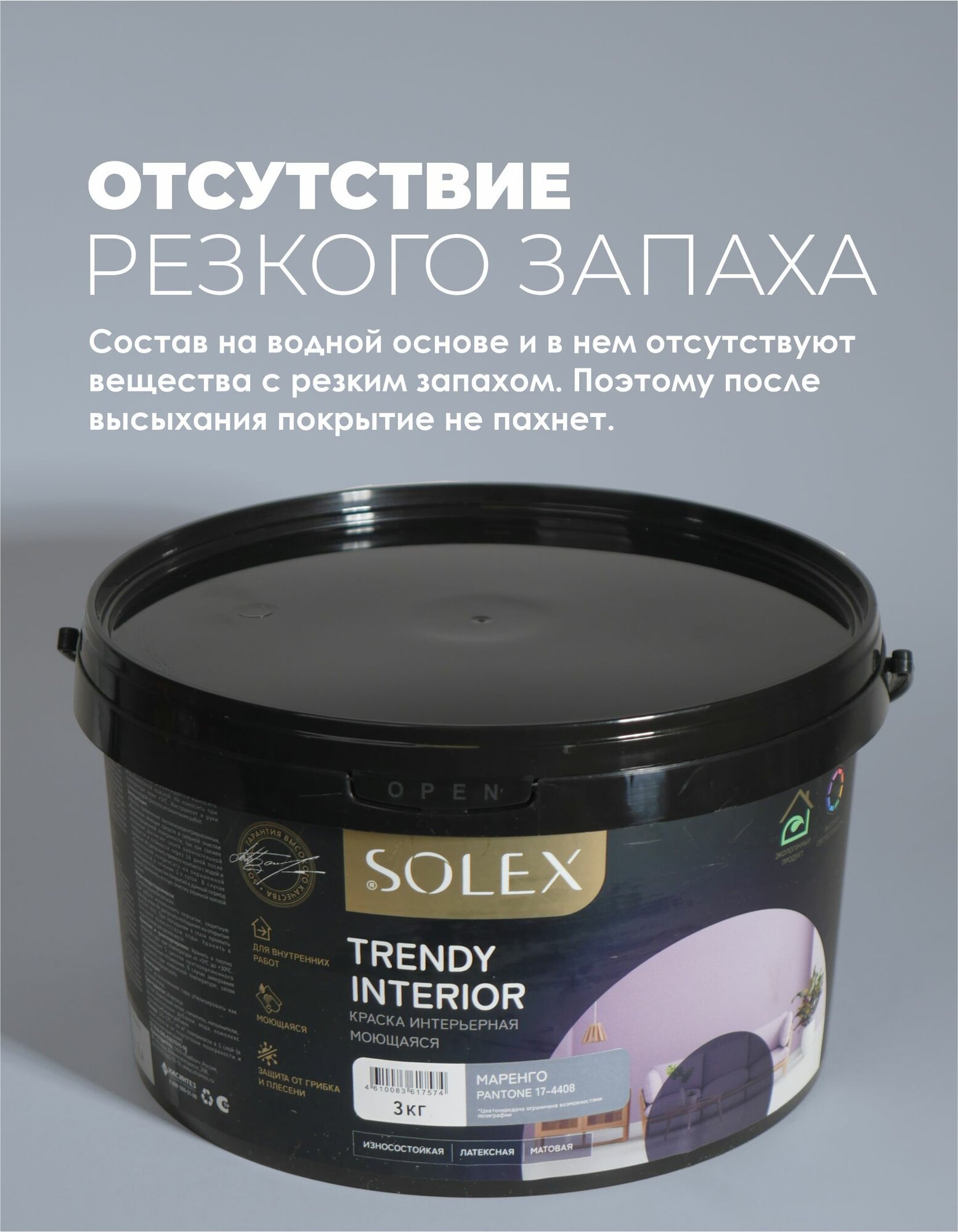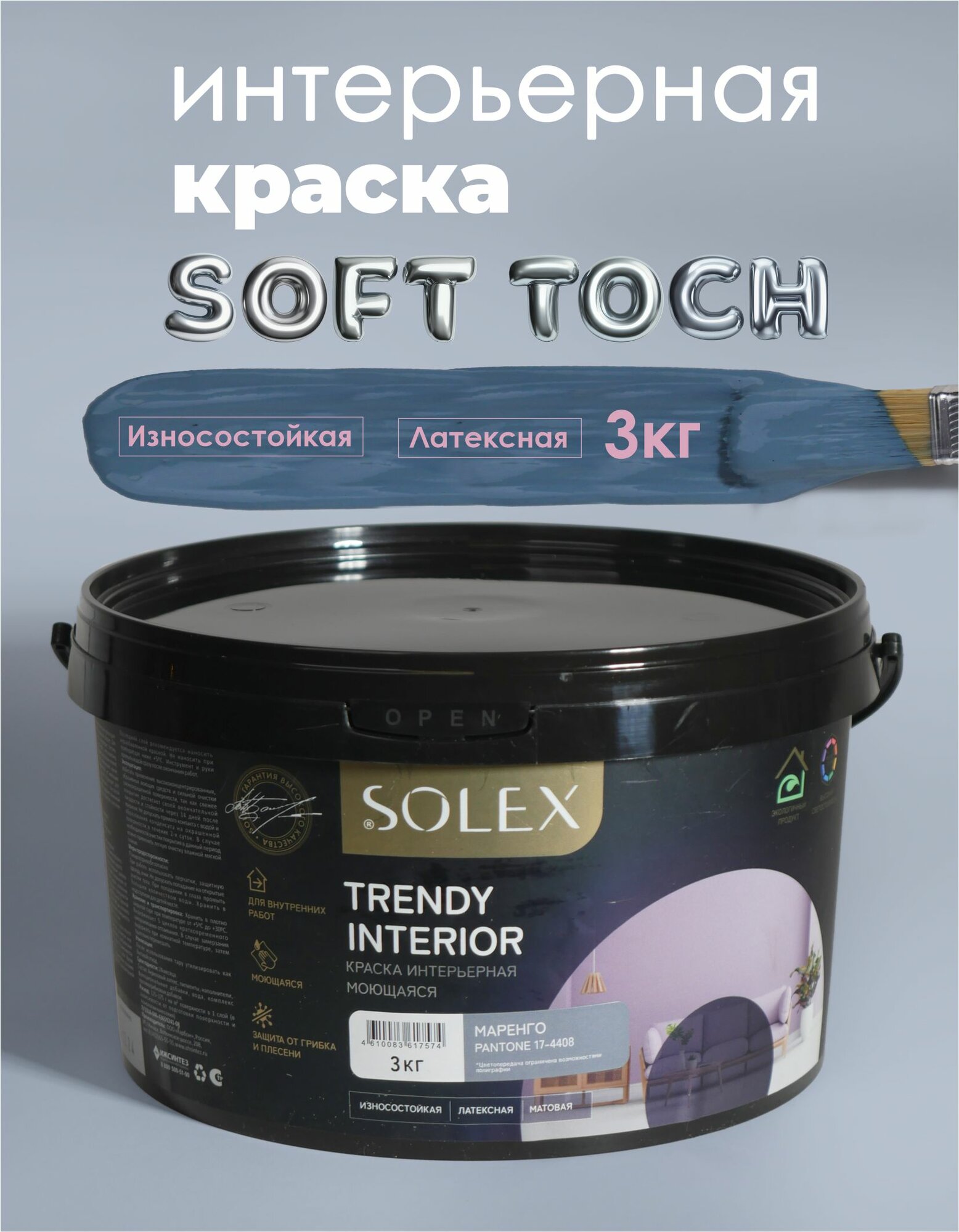 Краска для стен и обоев интерьерная моющаяся, TRENDY INTERIOR, SOLEX - маренго (3 кг.) информация: