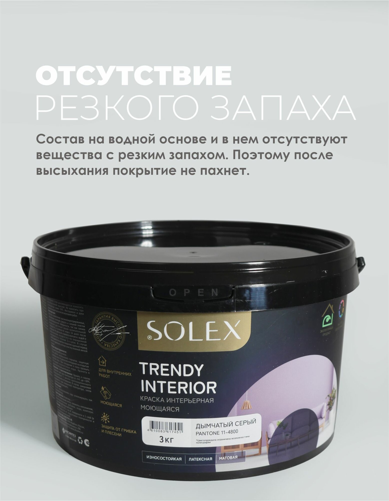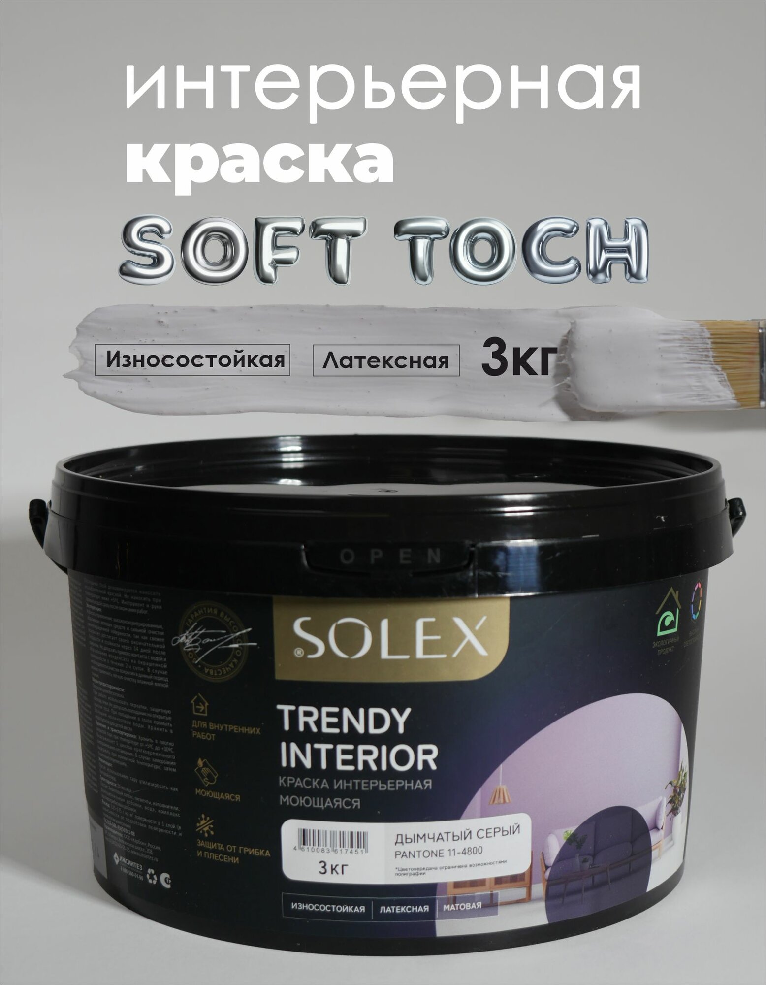 Краска для стен и обоев интерьерная моющаяся, TRENDY INTERIOR, SOLEX - дымчатый серый (3 кг.) информация: