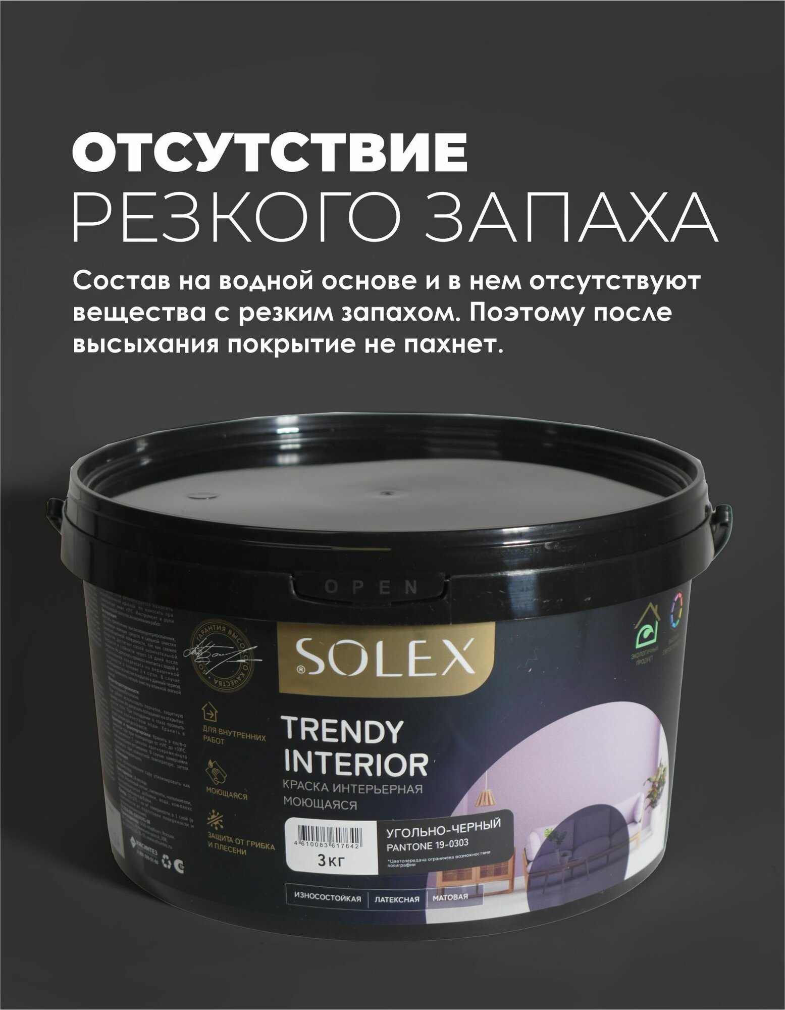 Краска для стен и обоев интерьерная моющаяся, TRENDY INTERIOR, SOLEX - угольно-черный (3 кг.) информация: