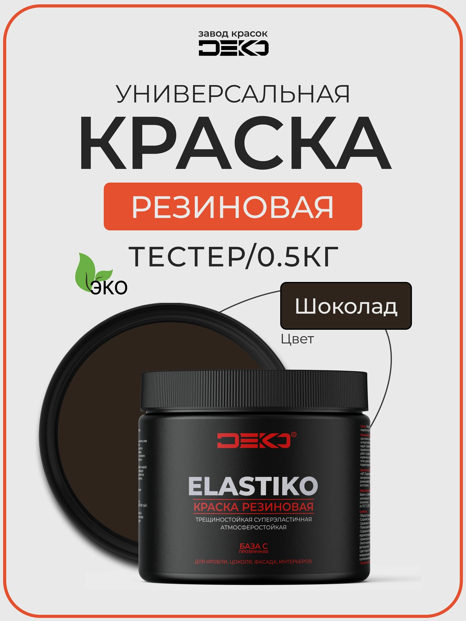 Краска резиновая акриловая DEKO ELASTIKO, цвет шоколад 500гр. Для влажных помещений, фасадов, стен и потолков информация: