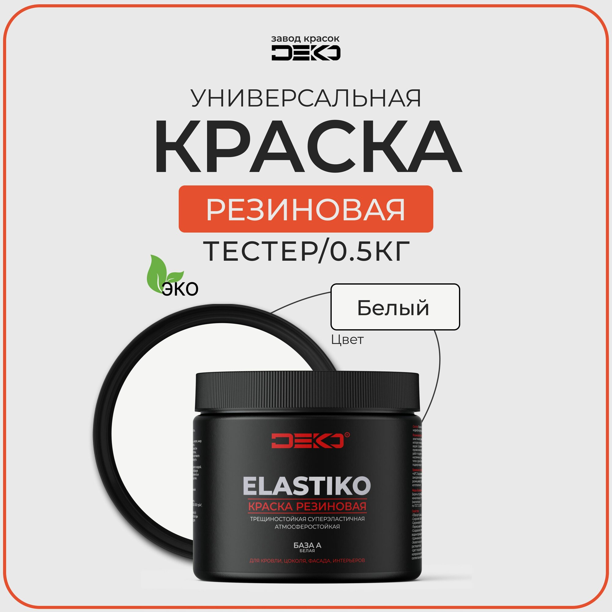 DEKO краска резиновая моющаяся для влажных помещений, тестер - 500гр. Для стен, фасадов и потолков. информация: