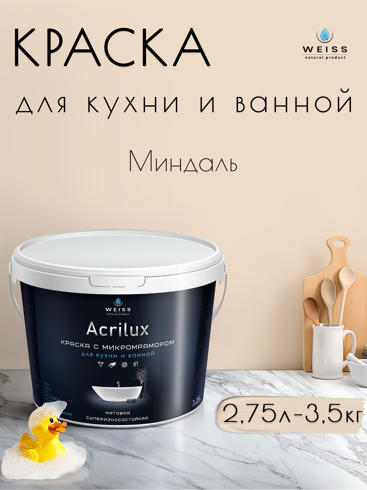 Краска акриловая, моющаяся для стен и влажных помещений, кухни и ванной комнаты 2.75л DEC753 Миндаль информация: