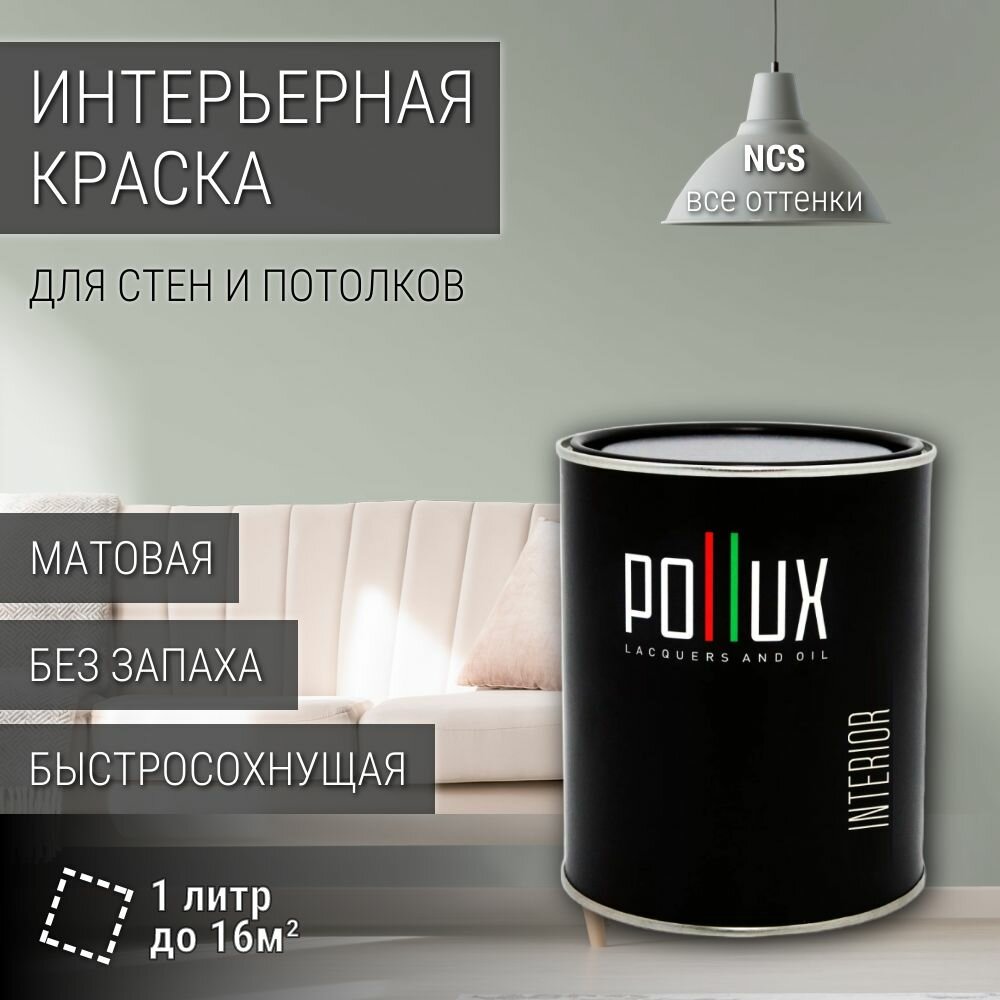 Краска моющаяся интерьерная для стен и потолков, Pollux INTERIOR без запаха, быстросохнущая, акриловая, матовое покрытие, цвет NCS S 2005-G30Y, 1л. информация: