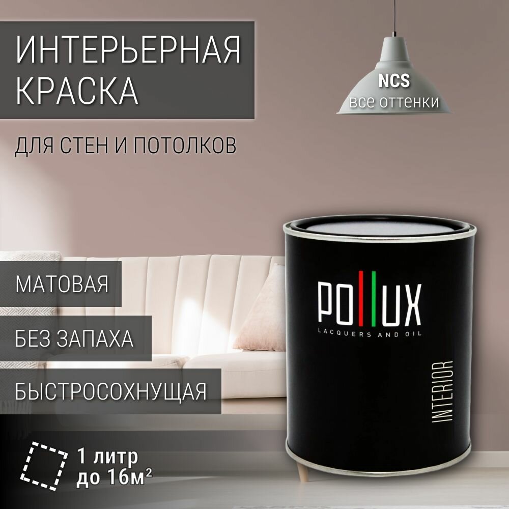 Краска моющаяся интерьерная для стен и потолков, Pollux INTERIOR без запаха, быстросохнущая, акриловая, матовое покрытие, цвет NCS S 3010-Y90R, 1л. информация: