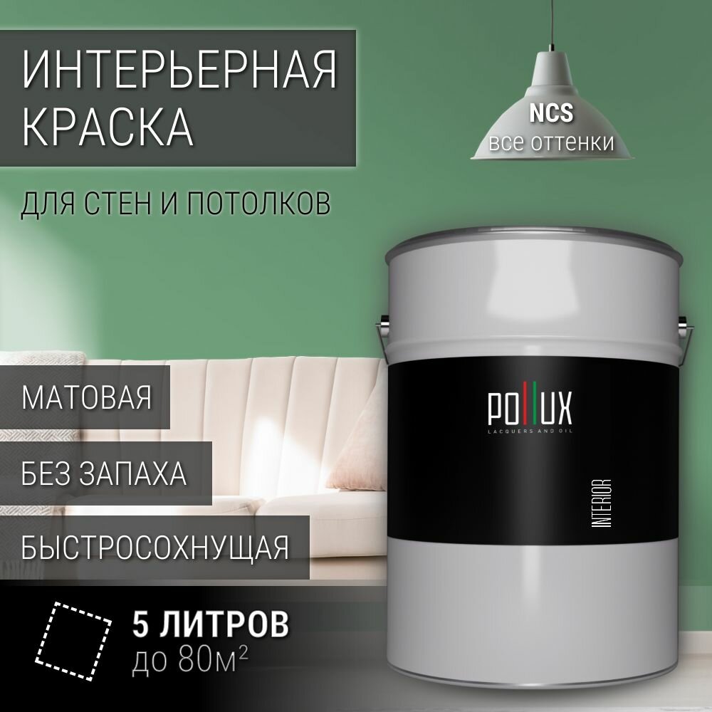 Краска моющаяся интерьерная для стен и потолков, Pollux INTERIOR без запаха, быстросохнущая, акриловая, матовое покрытие, цвет NCS S 3030-G10Y, 5л. информация: