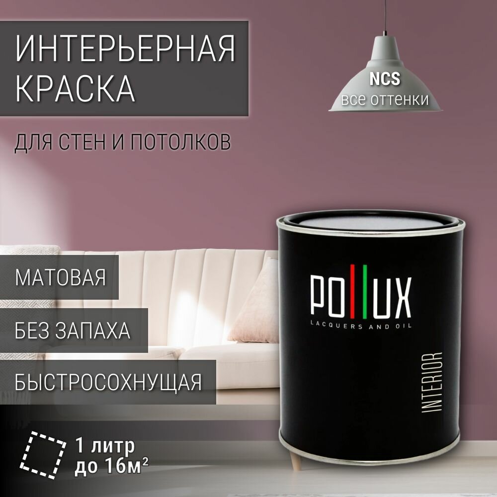 Краска моющаяся интерьерная для стен и потолков, Pollux INTERIOR без запаха, быстросохнущая, акриловая, матовое покрытие, цвет NCS S 4020-R20B, 1л. информация: