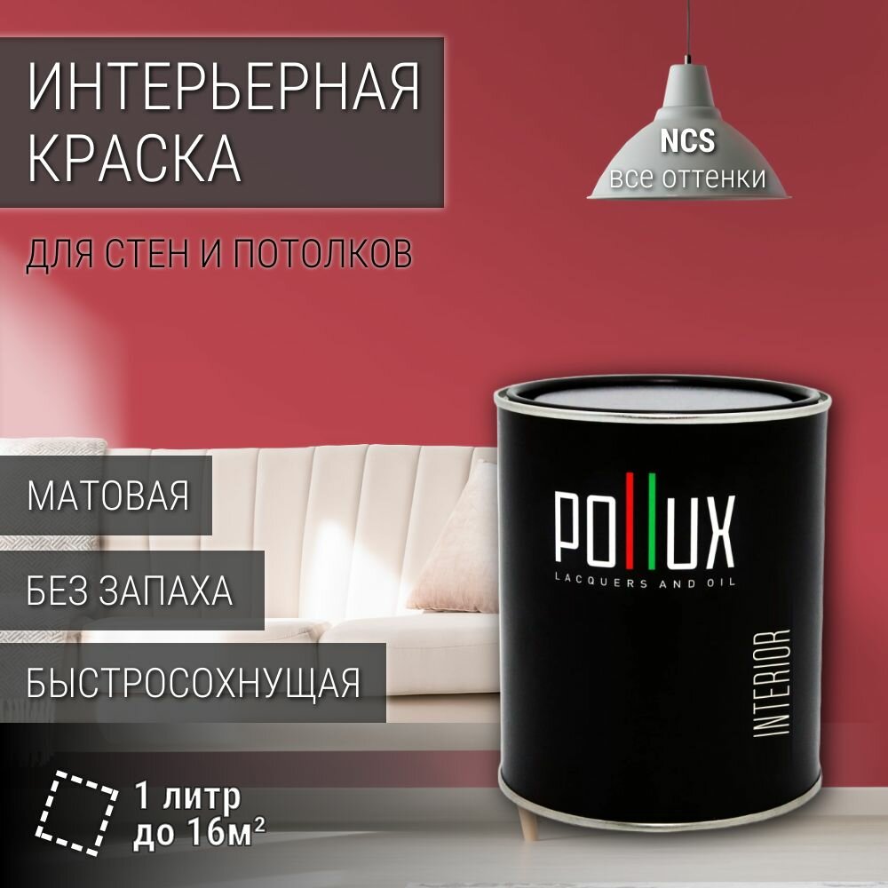 Краска моющаяся интерьерная для стен и потолков, Pollux INTERIOR без запаха, быстросохнущая, акриловая, матовое покрытие, цвет NCS S 2060-R, 1л. информация: