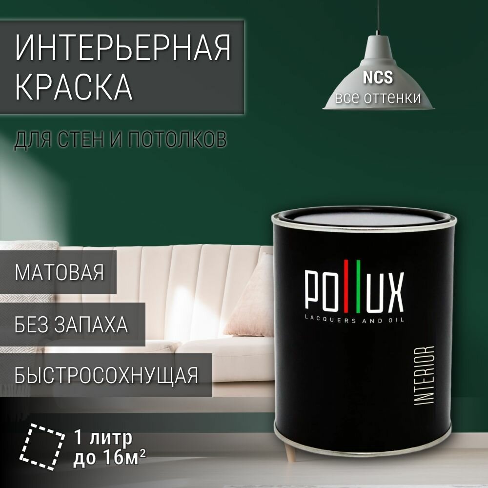 Краска моющаяся интерьерная для стен и потолков, Pollux INTERIOR без запаха, быстросохнущая, акриловая, матовое покрытие, цвет NCS S 7020-G, 1л. информация: