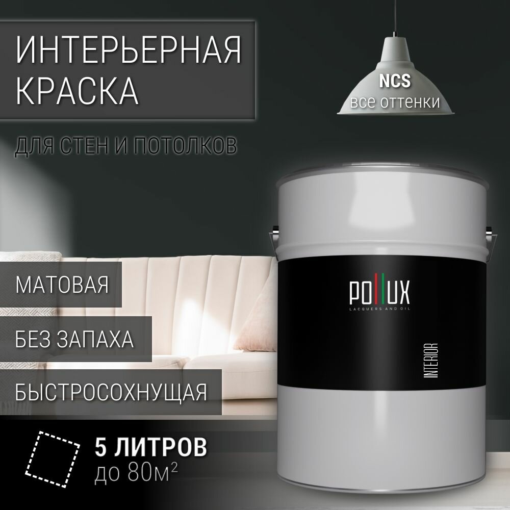 Краска моющаяся интерьерная для стен и потолков, Pollux INTERIOR без запаха, быстросохнущая, акриловая, матовое покрытие, цвет NCS S 8502-G, 5л. информация:
