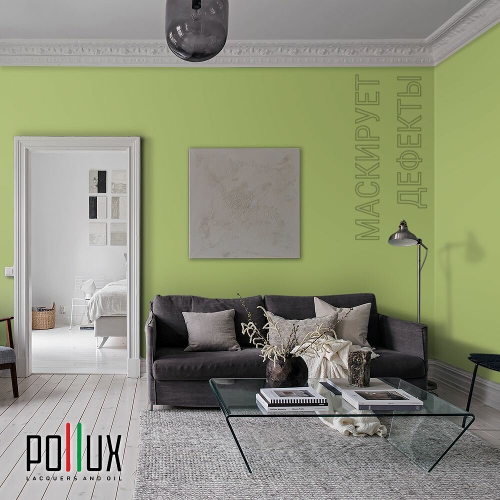 Краска моющаяся интерьерная для стен и потолков, Pollux INTERIOR без запаха, быстросохнущая, акриловая, матовое покрытие, цвет NCS S 2040-G50Y, 1л. информация: