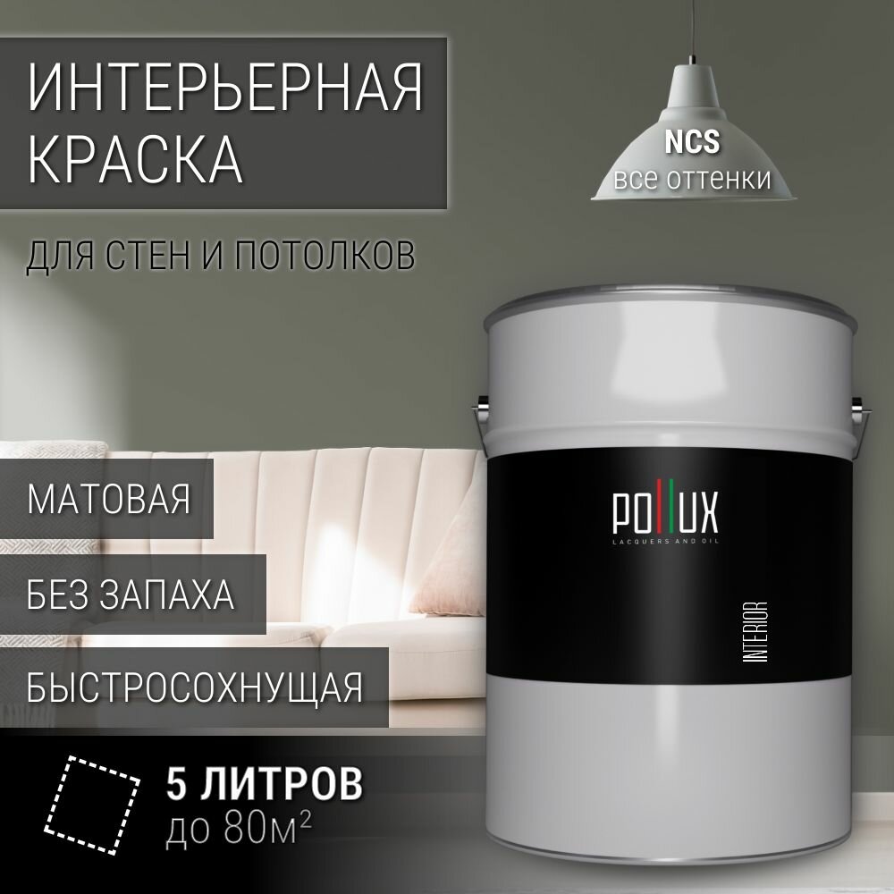 Краска моющаяся интерьерная для стен и потолков, Pollux INTERIOR без запаха, быстросохнущая, акриловая, матовое покрытие, цвет NCS S 7020-G50Y, 5л. 12 385 ₽