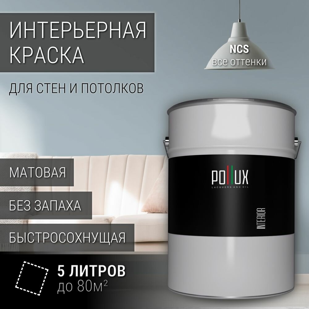 Краска моющаяся интерьерная для стен и потолков, Pollux INTERIOR без запаха, быстросохнущая, акриловая, матовое покрытие, цвет NCS S 2010-B, 5л. информация: