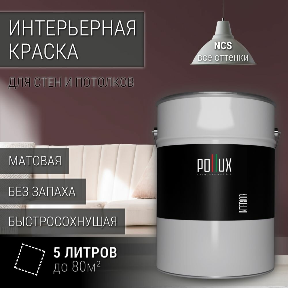 Краска моющаяся интерьерная для стен и потолков, Pollux INTERIOR без запаха, быстросохнущая, акриловая, матовое покрытие, цвет NCS S 7010-R10B, 5л. информация: