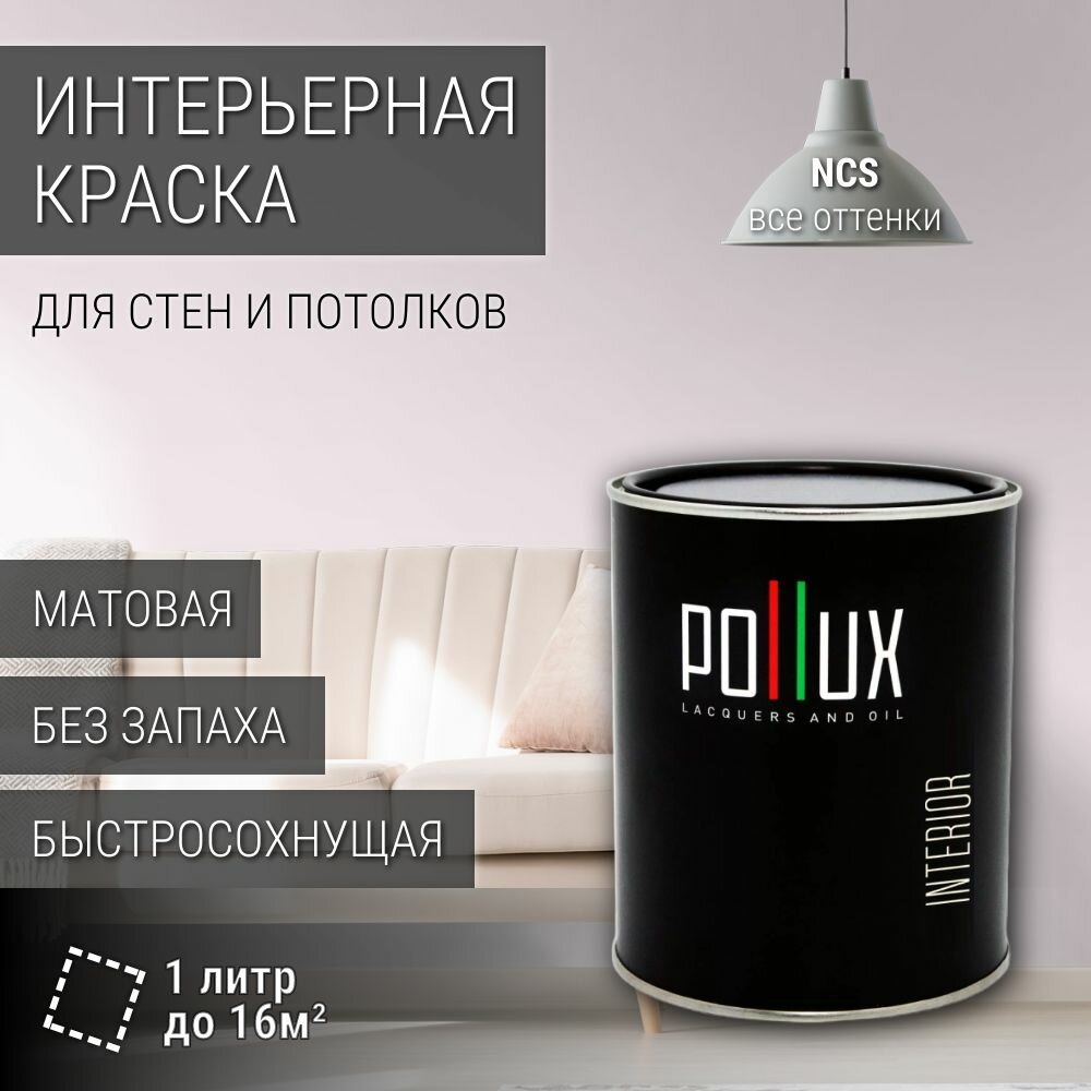 Краска моющаяся интерьерная для стен и потолков, Pollux INTERIOR без запаха, быстросохнущая, акриловая, матовое покрытие, цвет NCS S 0505-R30B, 1л. информация: