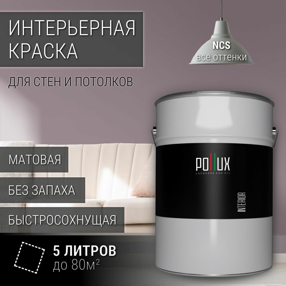 Краска моющаяся интерьерная для стен и потолков, Pollux INTERIOR без запаха, быстросохнущая, акриловая, матовое покрытие, цвет NCS S 4010-R30B, 5л. информация: