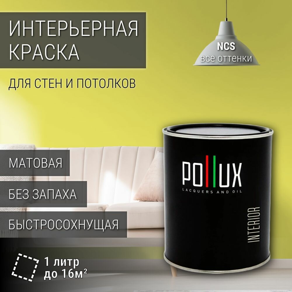 Краска моющаяся интерьерная для стен и потолков, Pollux INTERIOR без запаха, быстросохнущая, акриловая, матовое покрытие, цвет NCS S 0550-G80Y, 1л. информация: