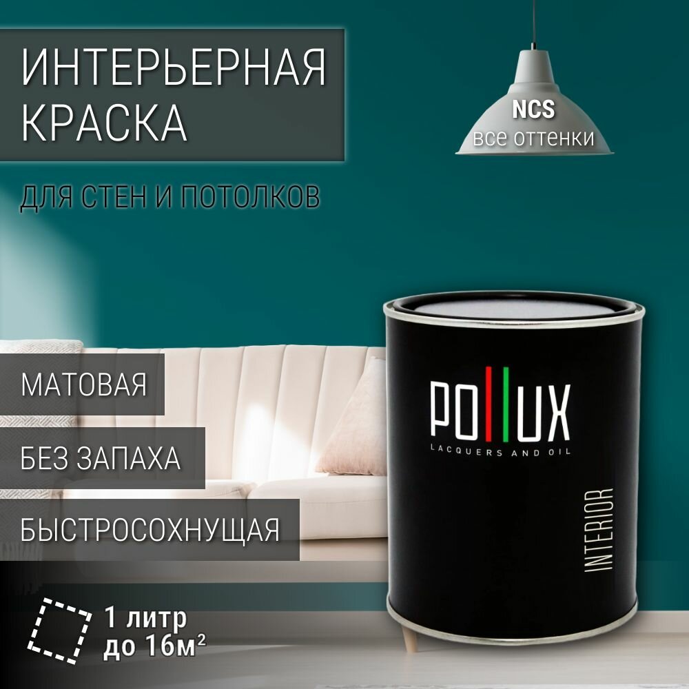 Краска моющаяся интерьерная для стен и потолков, Pollux INTERIOR без запаха, быстросохнущая, акриловая, матовое покрытие, цвет NCS S 5040-B40G, 1л. информация: