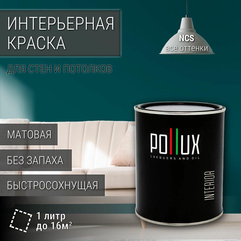 Краска моющаяся интерьерная для стен и потолков, Pollux INTERIOR без запаха, быстросохнущая, акриловая, матовое покрытие, цвет NCS S 5540-B40G, 1л. информация:
