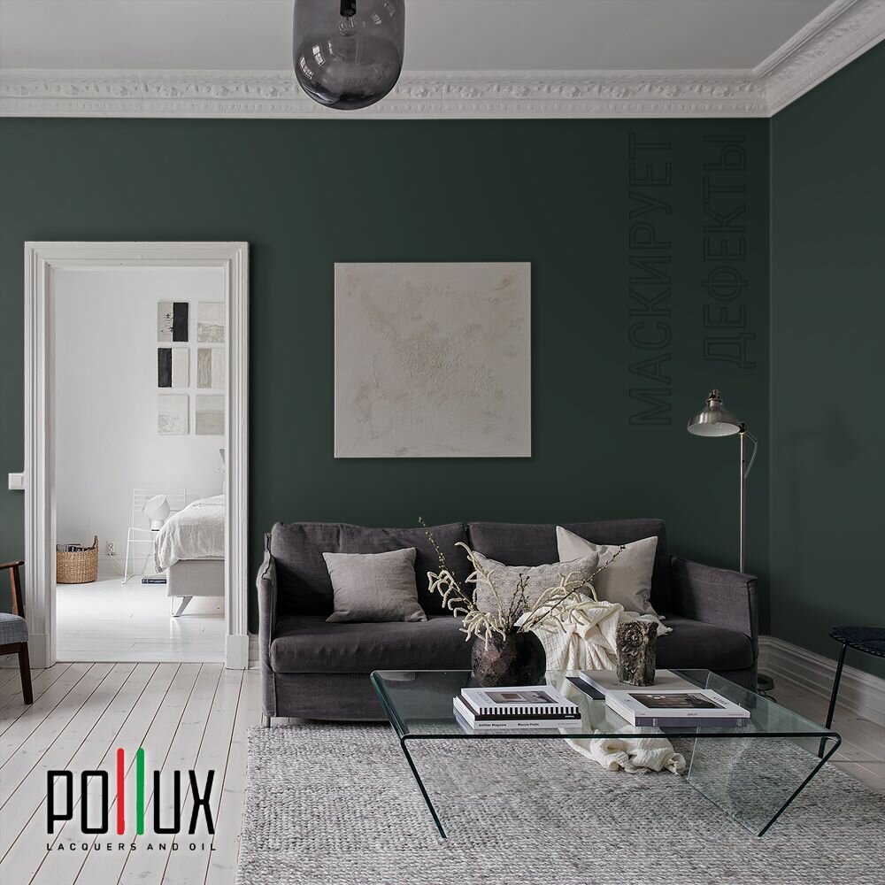 10 цен на Краска моющаяся интерьерная для стен и потолков, Pollux INTERIOR без запаха, быстросохнущая, акриловая, матовое покрытие, цвет NCS S 8505-B80G, 1л.