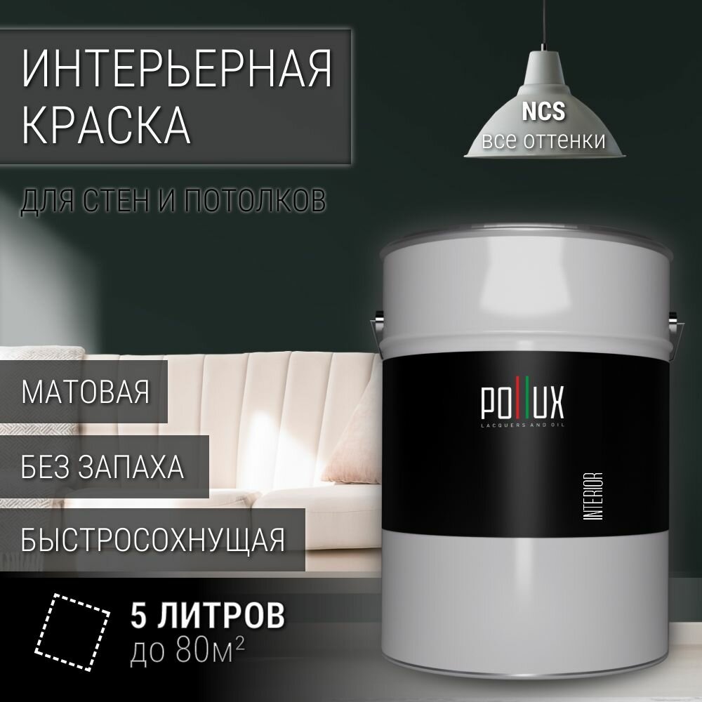 Краска моющаяся интерьерная для стен и потолков, Pollux INTERIOR без запаха, быстросохнущая, акриловая, матовое покрытие, цвет NCS S 8505-B80G, 5л. информация: