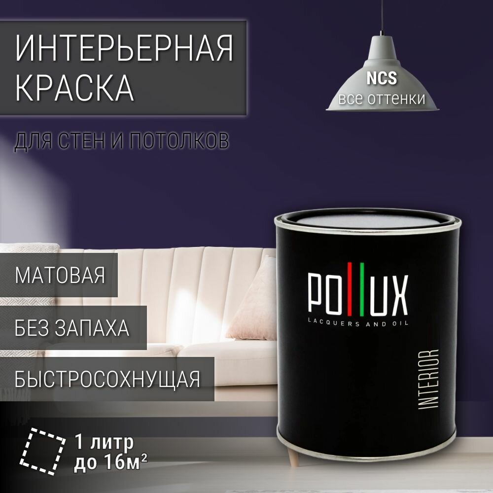 10 цен на Краска моющаяся интерьерная для стен и потолков, Pollux INTERIOR без запаха, быстросохнущая, акриловая, матовое покрытие, цвет NCS S 7020-R60B, 1л.