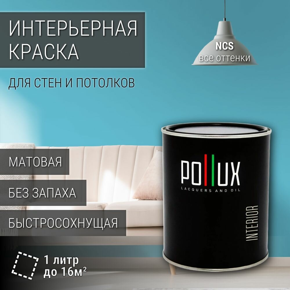 Краска моющаяся интерьерная для стен и потолков, Pollux INTERIOR без запаха, быстросохнущая, акриловая, матовое покрытие, цвет NCS S 1040-B10G, 1л. информация: