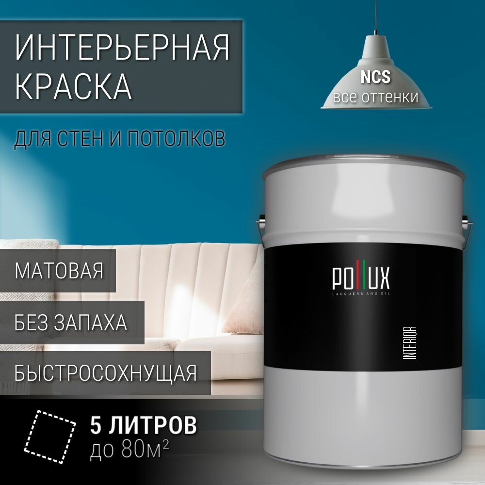 Краска моющаяся интерьерная для стен и потолков, Pollux INTERIOR без запаха, быстросохнущая, акриловая, матовое покрытие, цвет NCS S 3060-B10G, 5л. информация: